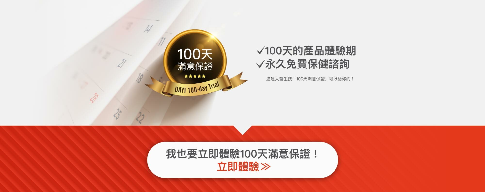 我們除了鼓勵你退貨之外,還提供你100天的滿意保證,包括這中間開封一瓶的成本,還有來回運輸的費用,全部都是由大醫負擔,也就是給消費者完全0風險的購物承諾!這是一個相當好的互信模式,也是我們很樂意去承擔的企業精神。