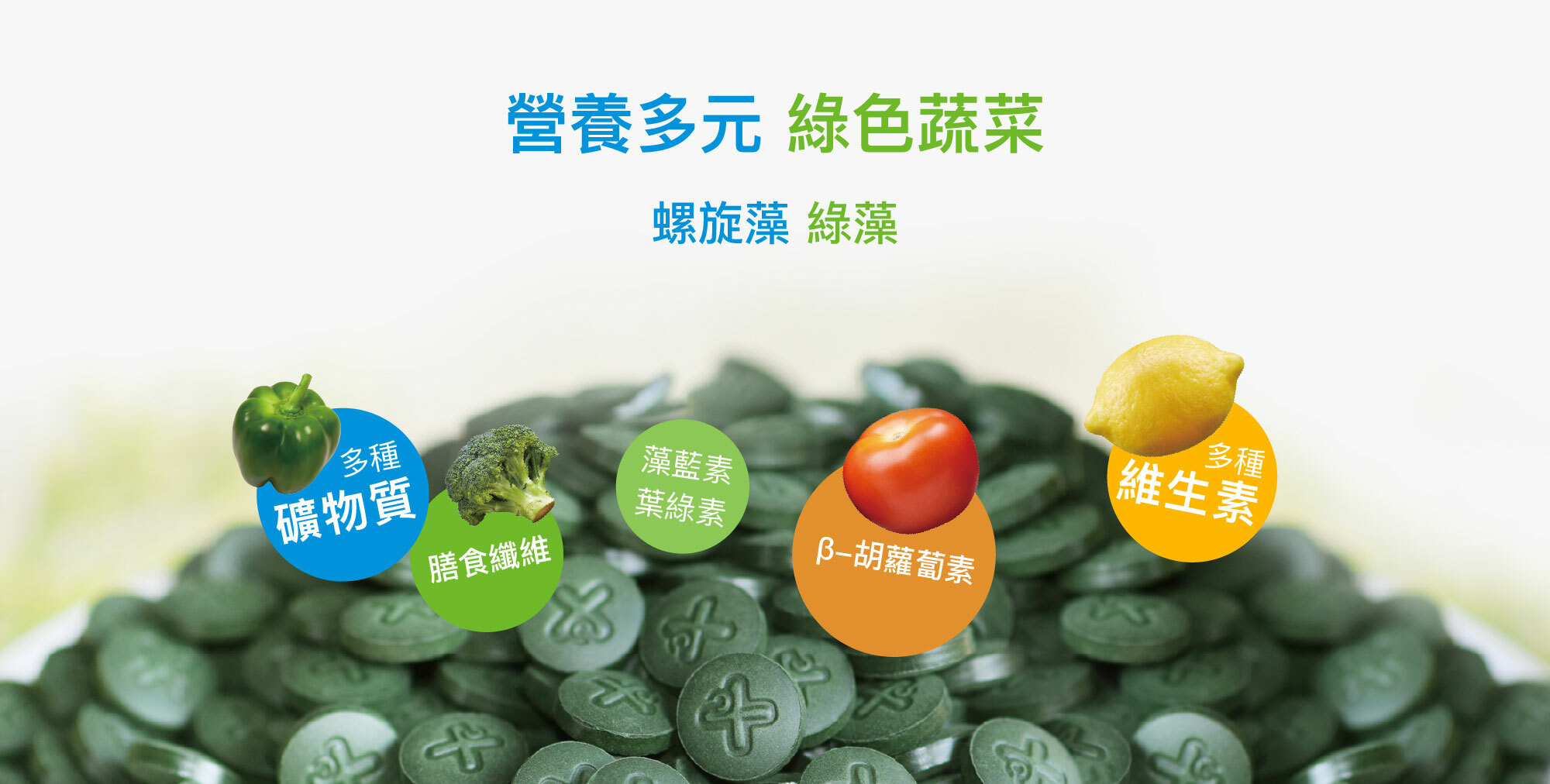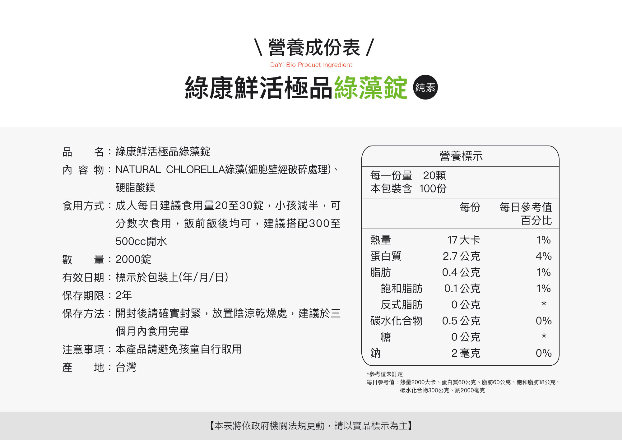 註:綠藻、螺旋藻為天然養殖,營養素會隨氣候等因素略有不同,以上營養素供參考。