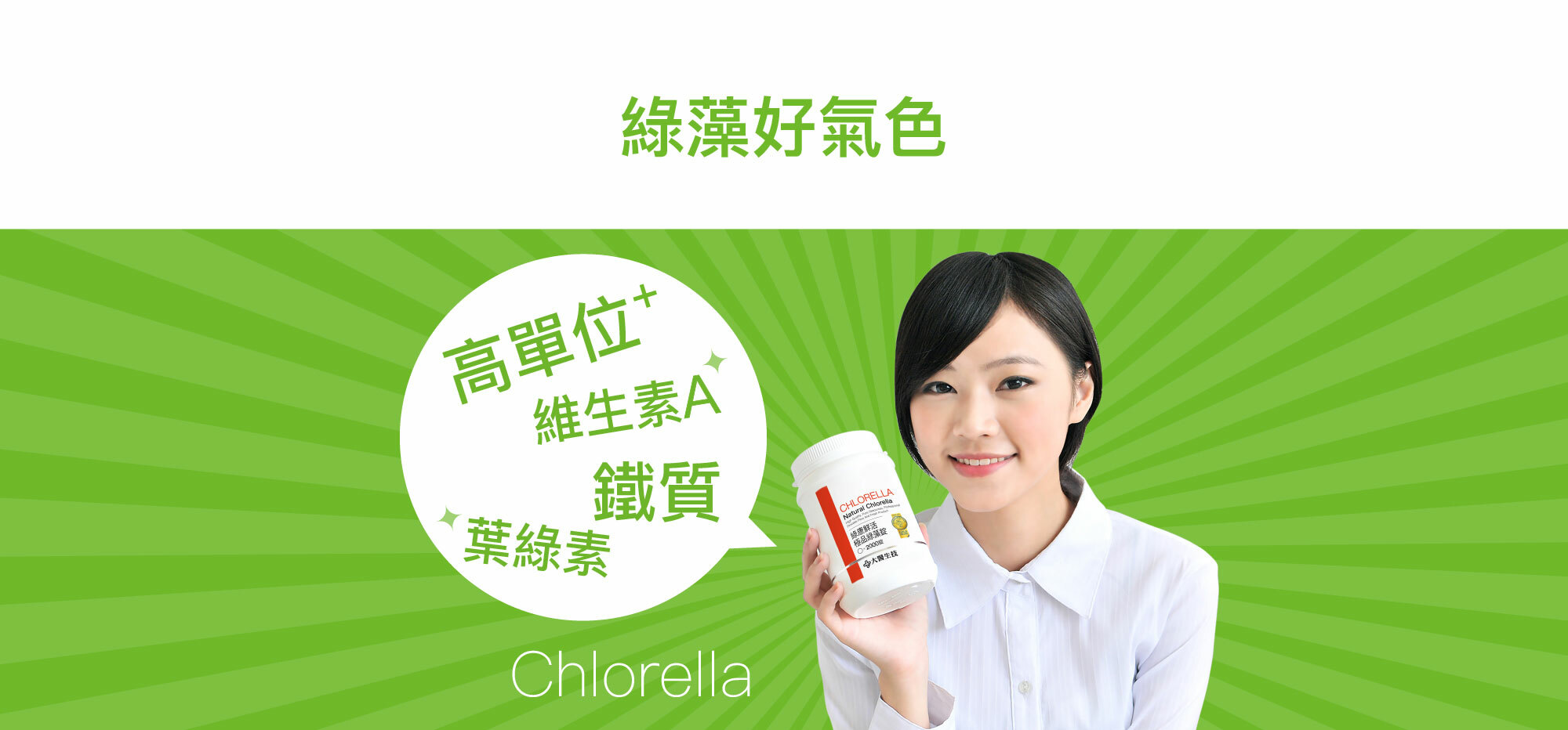綠藻含有豐富且均衡的維生素、礦物質,其中維生素A、B12、鐵、β-胡蘿蔔素的含量也很豐富,有助於維持在暗處的視覺、增進皮膚與黏膜的健康,並幫助牙齒和骨骼的發育與生長。維生素B12有助於紅血球的形成、增進神經系統的健康。綠藻的特色在於其獨特的[葉綠素],葉綠素(Chlorophyll)是一種綠色色素,存在於藻類和植物的葉綠體,此外綠藻還含有綠藻生長因子(CGF),可調整體質、促進新陳代謝,幫助調節生理機能。