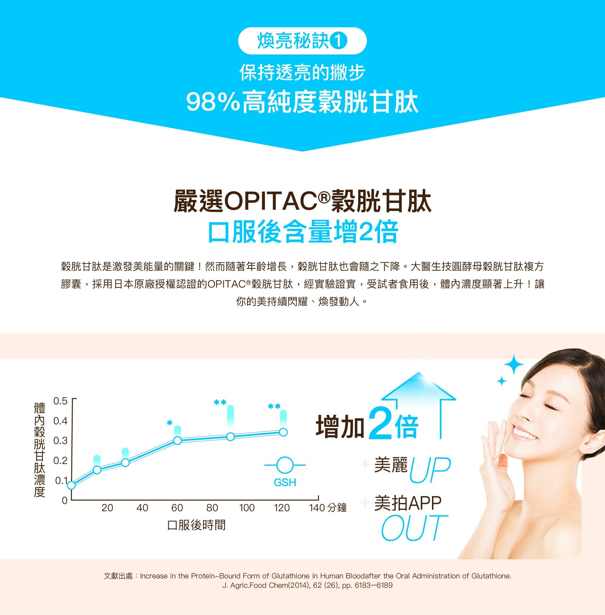 ANS:日本三菱商事生命科学株式会社與京都府立大學於 ISNFF 及 JAFC 期刊共同發表食用穀胱甘肽(圓酵母TorulaYeast)之研究數據,顯示服用圓酵母發酵的穀胱甘肽1小時後,體內 GSH 含量增加 2 倍,含量大幅增加!