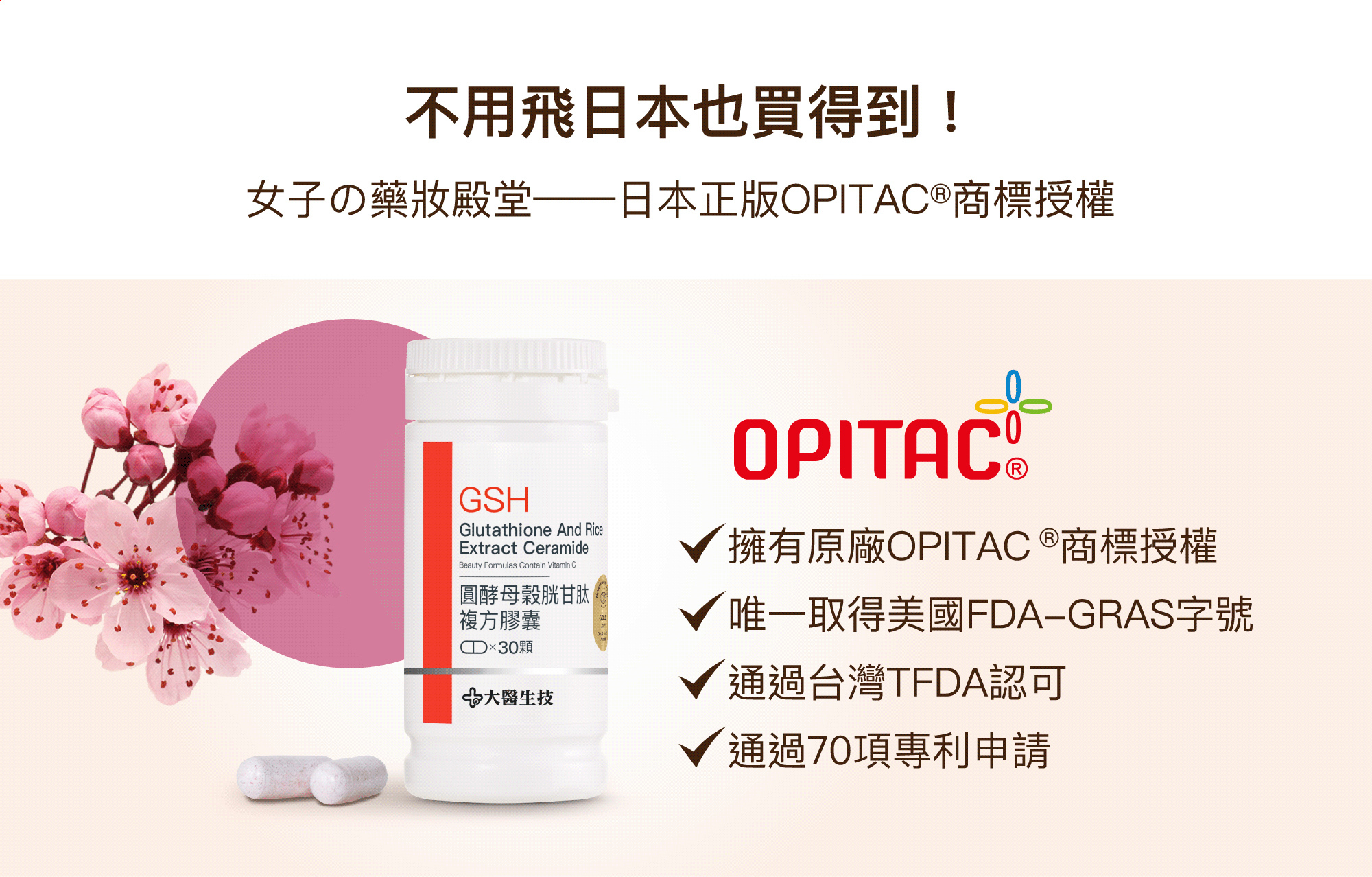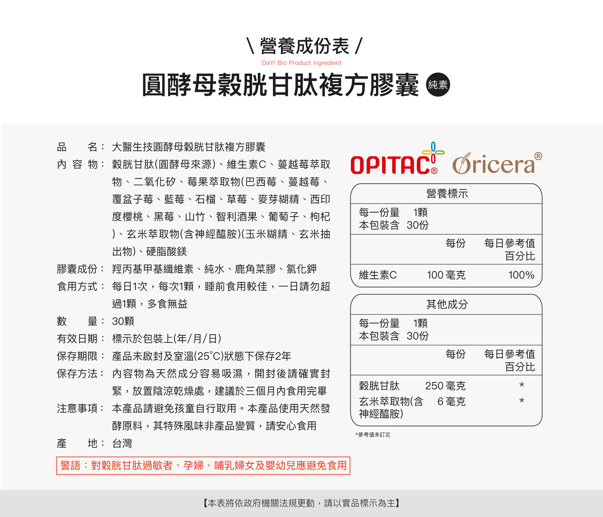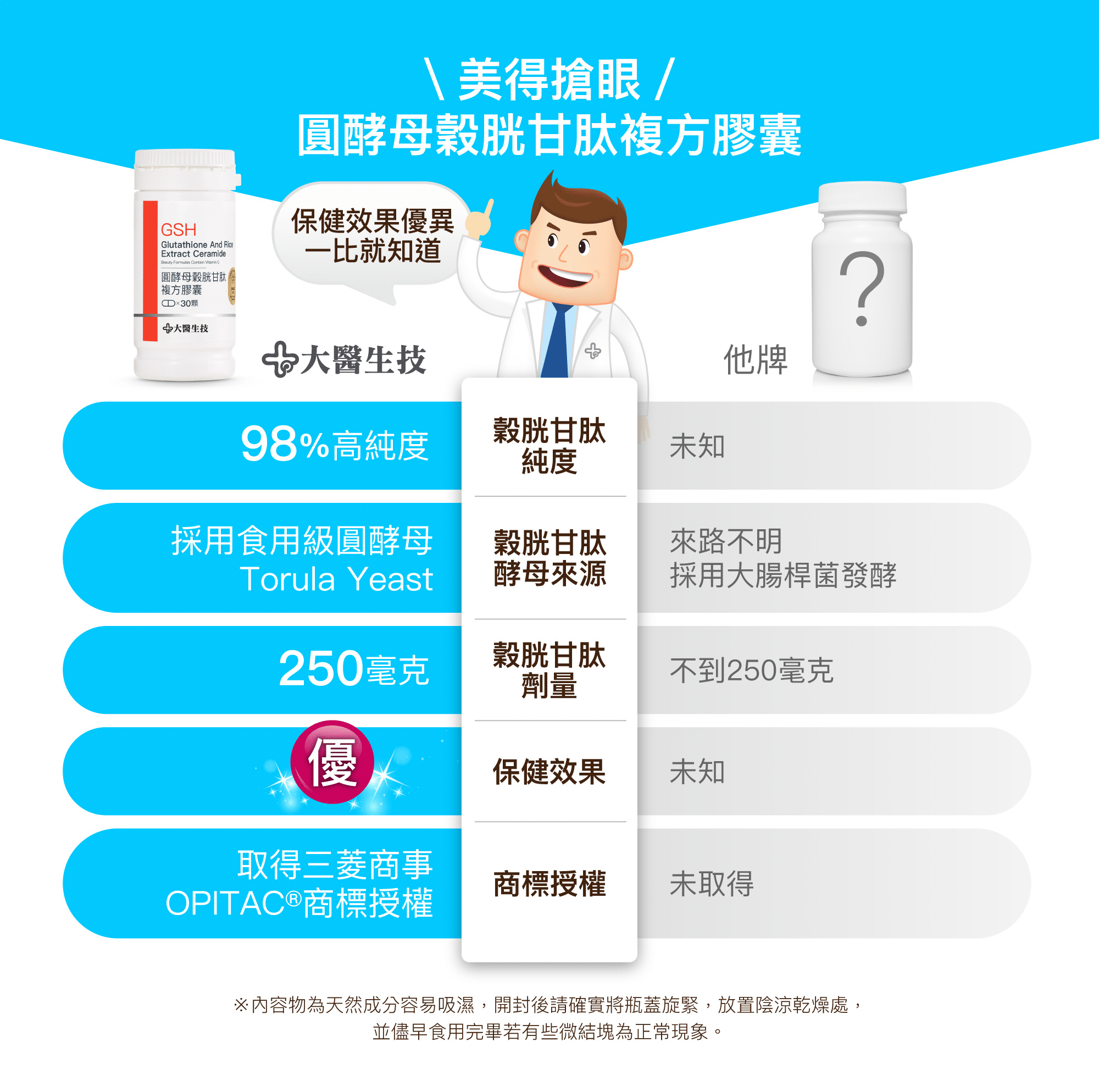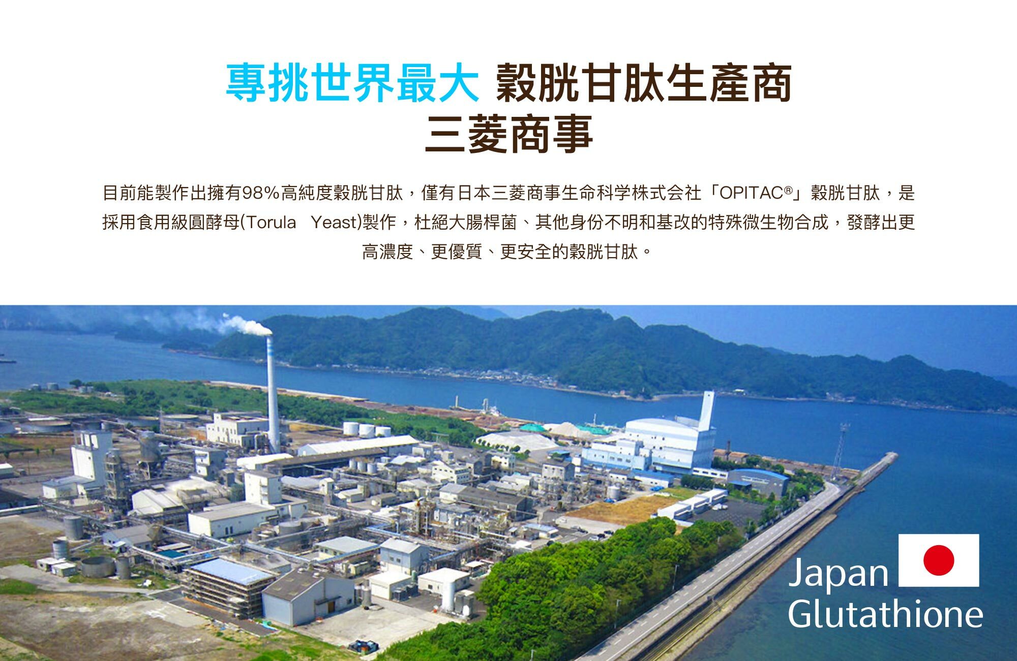 ANS:穀胱甘肽萃取自圓酵母 TorulaYeast。三菱商事生命科学株式会社「頂極OPITAC®」穀胱甘肽是採用 Non-GMO 天然食用圓酵母 TorulaYeast 生產的天然高濃度榖胱甘肽,並擁有相關製程專利。絕非合成型榖胱甘肽,也不使用致病細菌(如大腸桿菌)、其他身份不明或基因改造的微生物,市面出現中國大陸或其他地區的低價穀胱甘肽絕不是來自圓酵母,而是以基改麵包酵母或大腸桿菌生產。