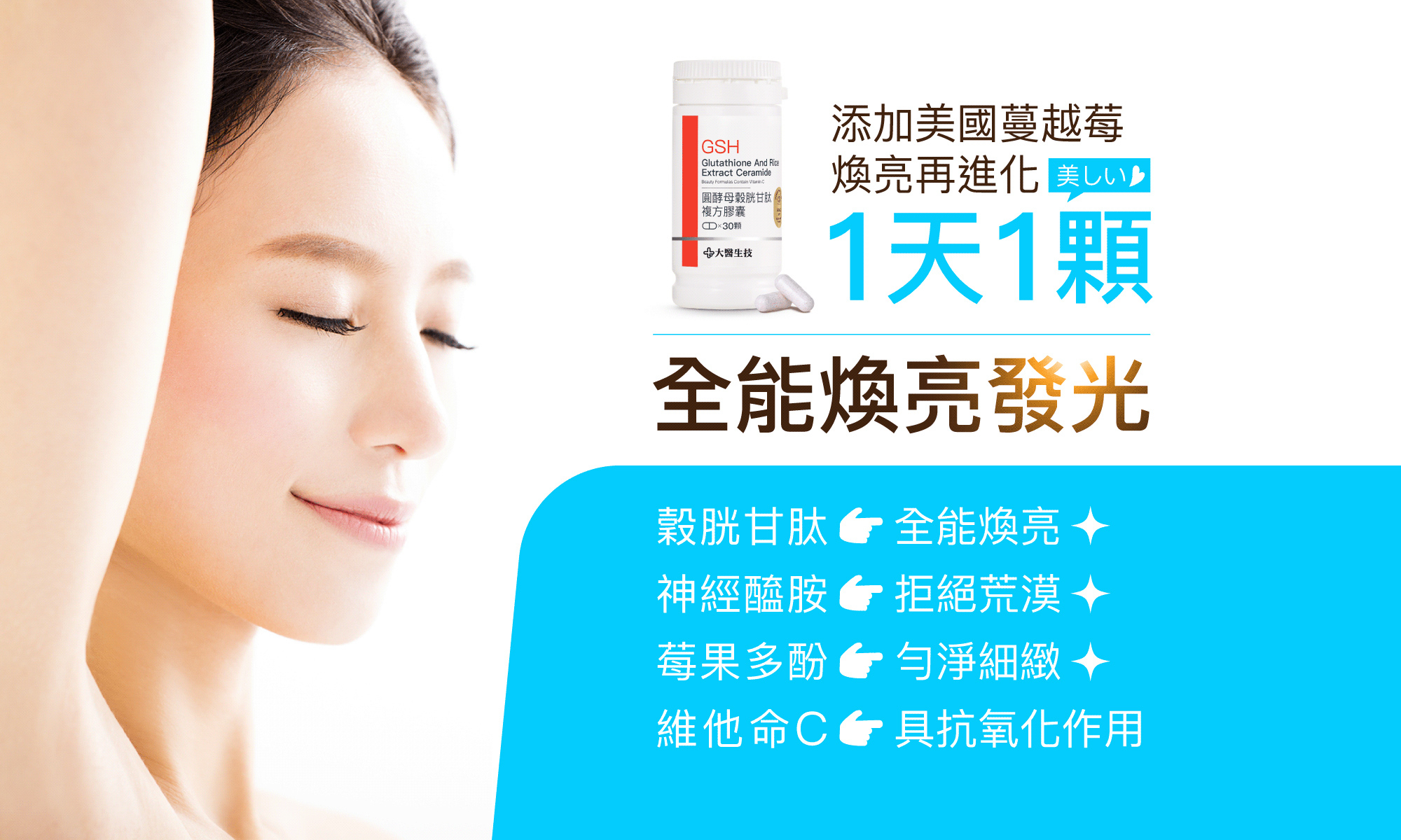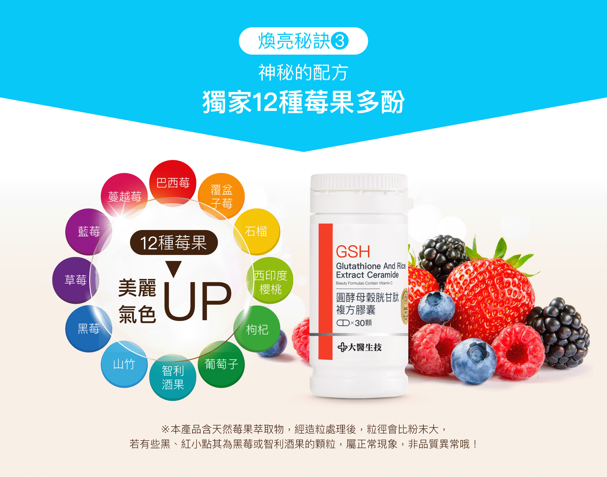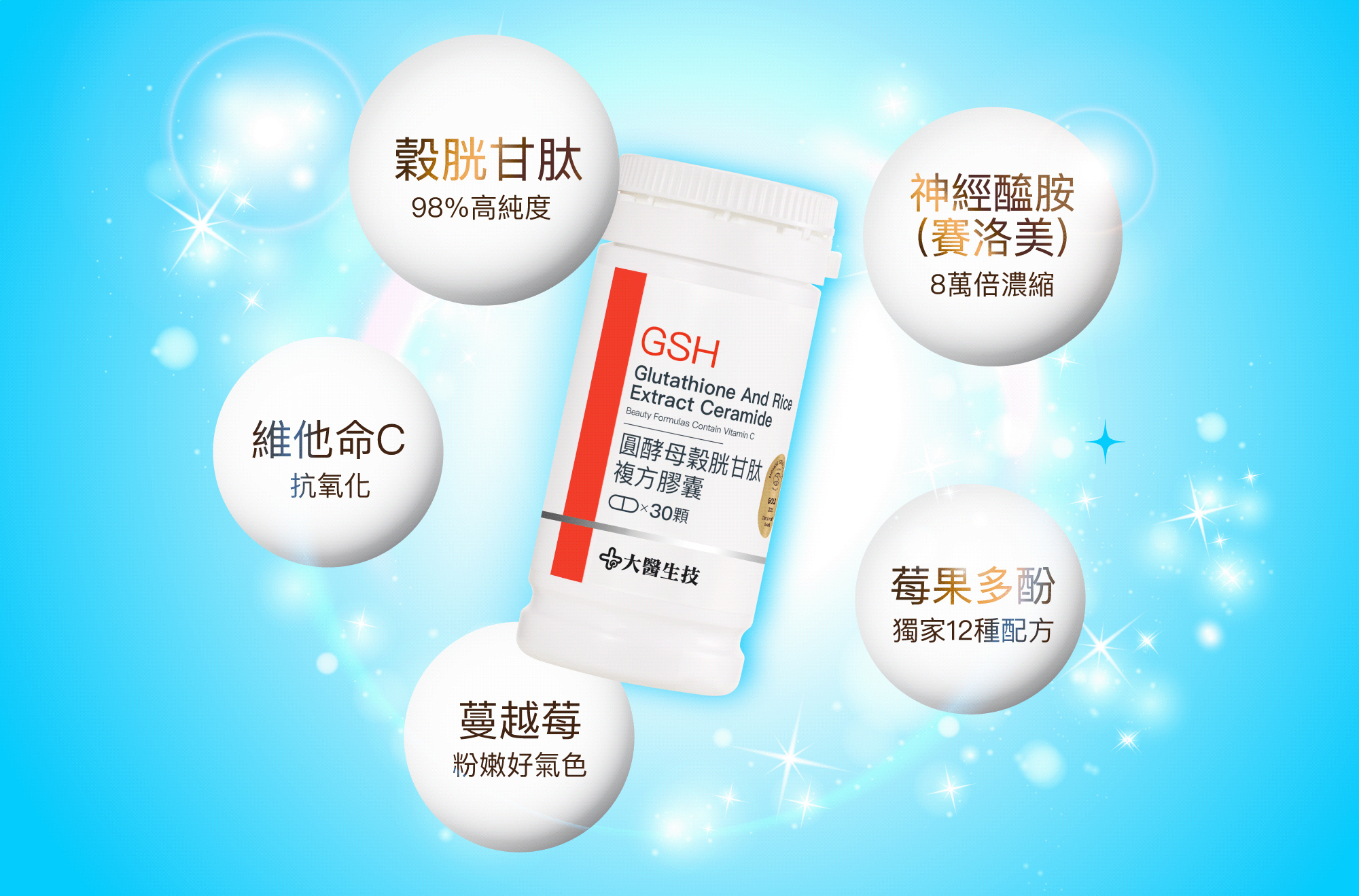 ANS:大醫生技圓酵母穀胱甘肽複方膠囊含圓酵母萃取 98% 高純度穀胱甘肽(GSH),可補充體內GSH、從根本散發自然光;非基改玄米萃取的神經醯胺(賽洛美),讓身體保持滿滿地水潤感!此外,特別添加 12 種莓果萃取物,含天然的植物營養素,如類黃酮、維生素、礦物質等,以及最重要的花青素等天然多酚物質;維他命 C 可促進膠原蛋白的形成,具抗氧化作用,讓你由內而外散發迷人光彩!
