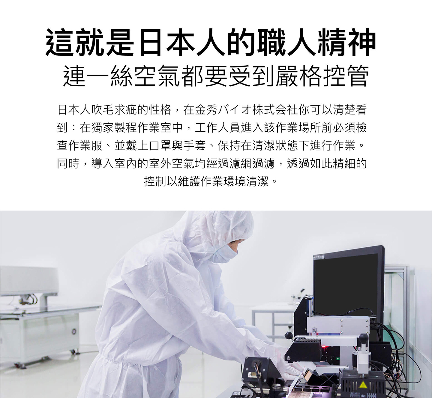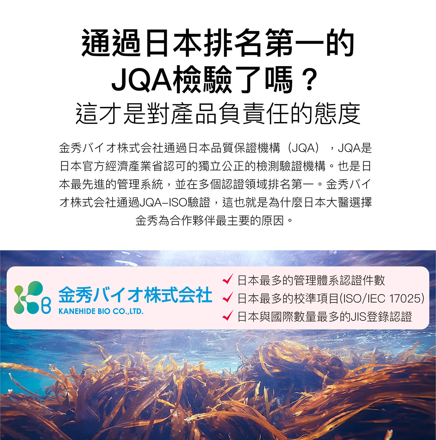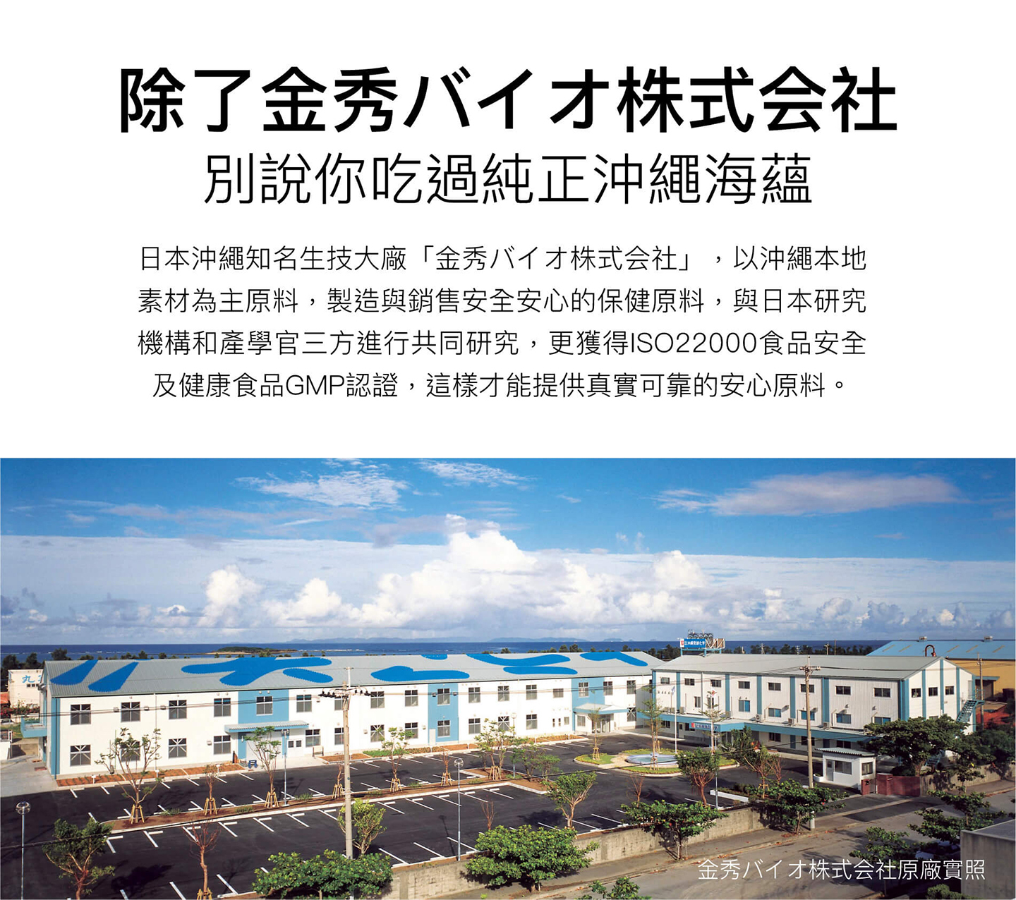 A:金秀バイオ株式会社位於有「藥草的寶庫」之稱的沖繩,目前沖繩縣海蘊的年產量已達2萬噸左右、佔日本全國總量9成以上。金秀バイオ株式會社從沖繩的自然環境探索原料,使用專利技術萃取高品質產品,並通過日本品質保證機構JQA-ISO驗證,JQA是日本官方經濟產業省認可的獨立公正的檢測驗證機構,也是日本最先進的管理系統,並在多個認證領域排名第一,這也就是為什麼日本大醫選擇金秀為合作夥伴最主要的原因。