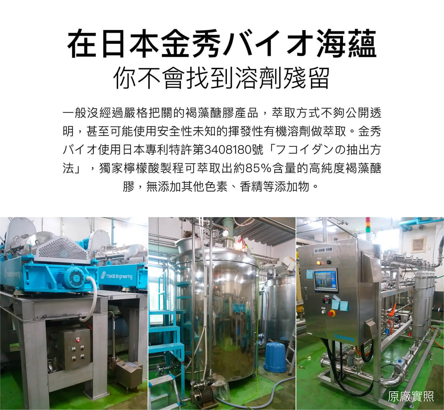 A:日本金秀バイオ使用日本專利特許第3408180號「フコイダンの抽出方法」,水萃方式不使用有機溶劑,獨家檸檬酸製程可萃取出約85%含量的高純度褐藻醣膠,保留完整活性與多醣體結構,獲得100倍濃縮精華成品,100%原料粉末無添加賦形劑、色素、香料等添加物,讓你食用更放心哦。