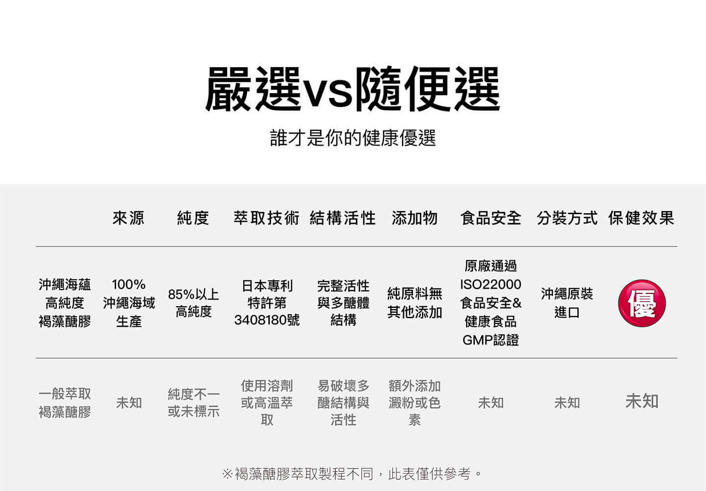 A:來自日本沖繩當地的海蘊萃取(含褐藻醣膠),成份100%全為高純度褐藻醣膠,無任何其他添加物。