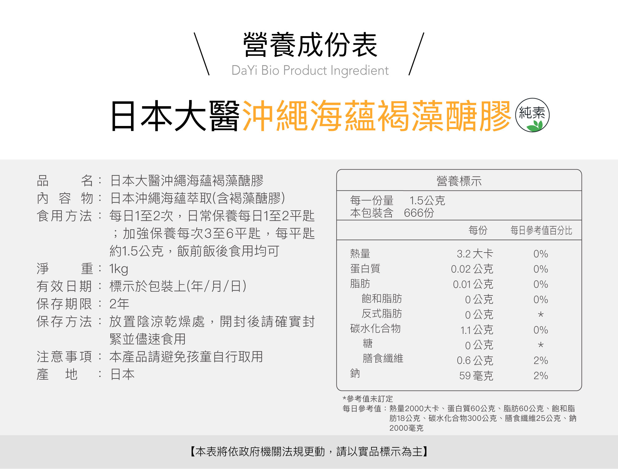 A:褐藻醣膠為多個岩藻醣結合硫酸基的多醣體,其中硫酸基是保健效果的關鍵,日本大醫沖繩海蘊褐藻醣膠硫酸基含量皆為13%以上哦。