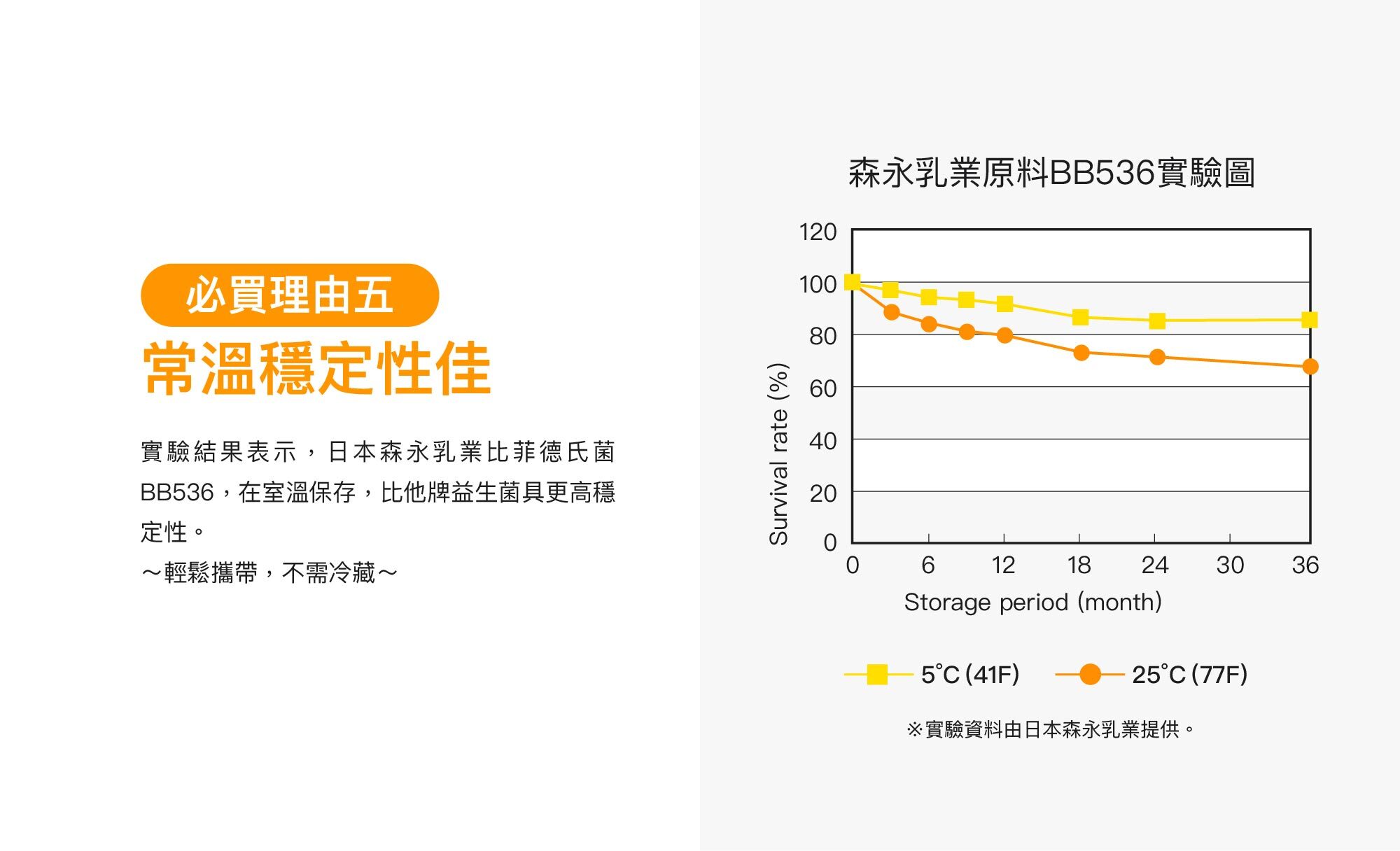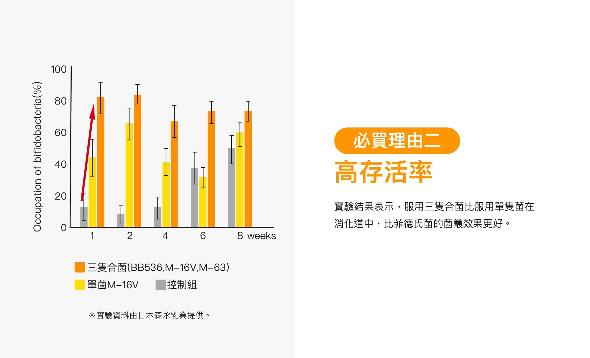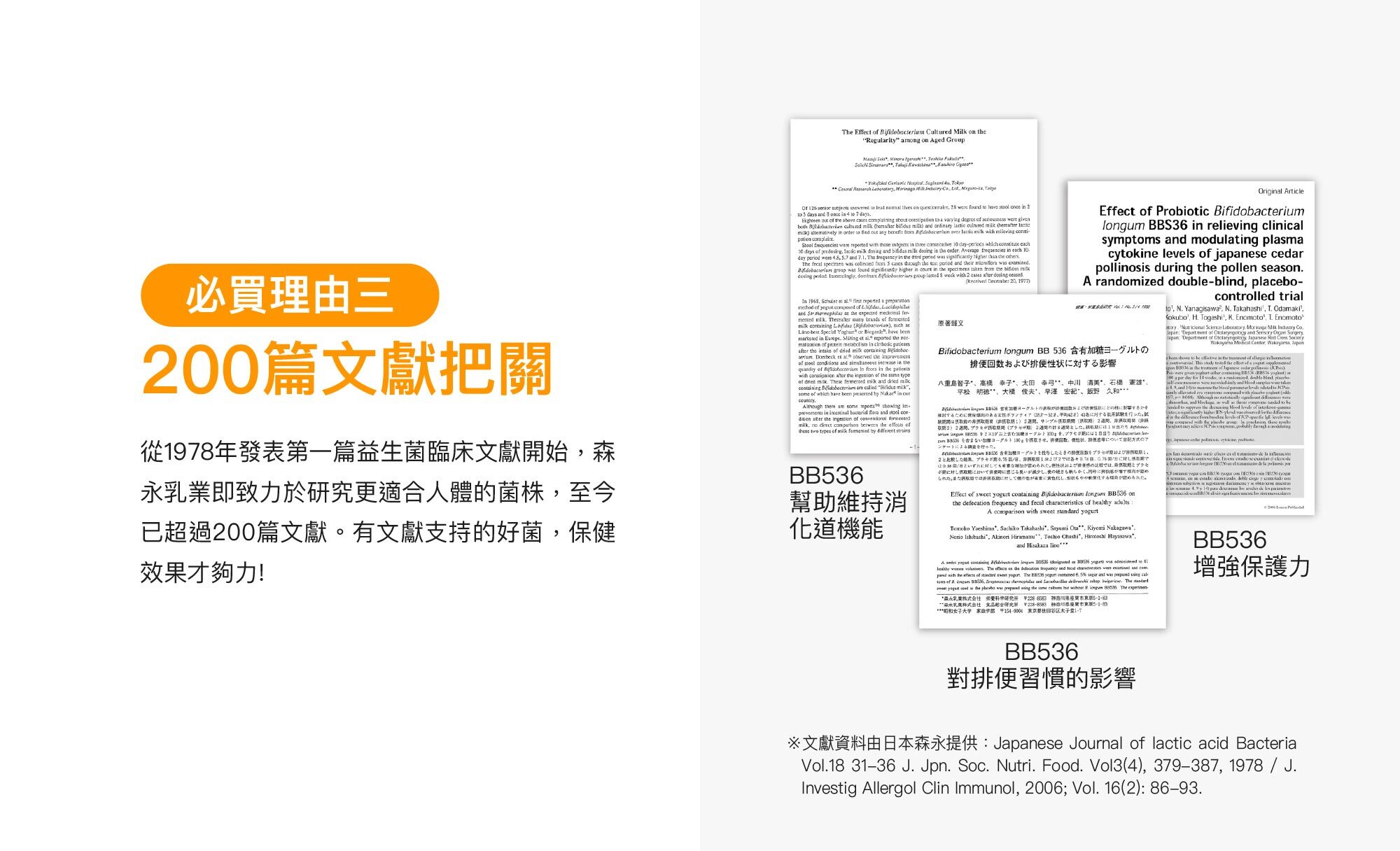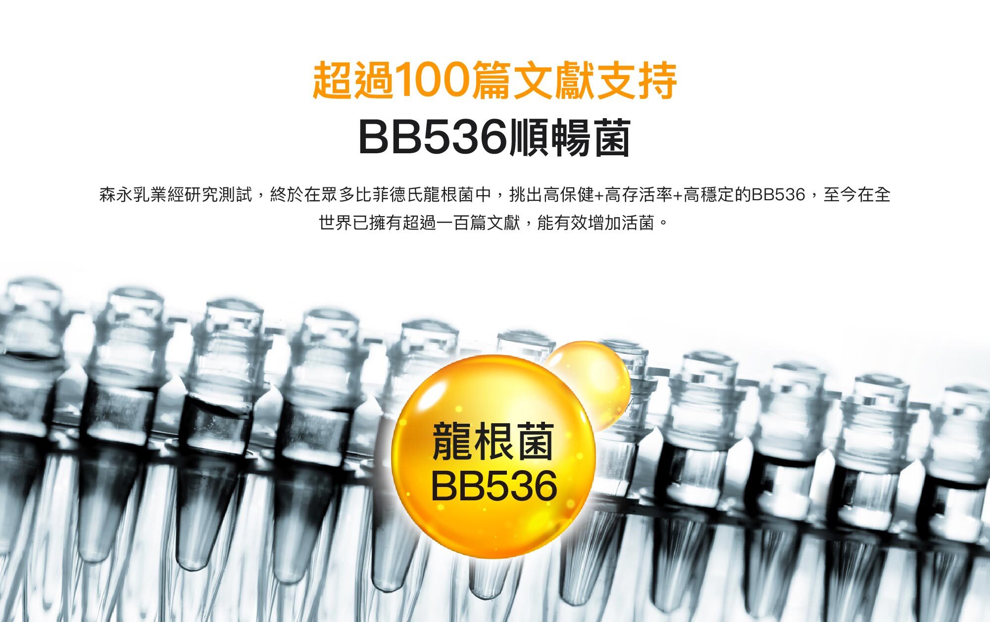 1.BB536順暢菌:森永乳業經多次研究與測試,終於在5百多支比菲德氏龍根菌中,挑出高保健+高存活率+高穩定的BB536龍根菌,至今在全世界已擁有超過一百篇文獻,能有效增加活菌,幫助排便順暢。