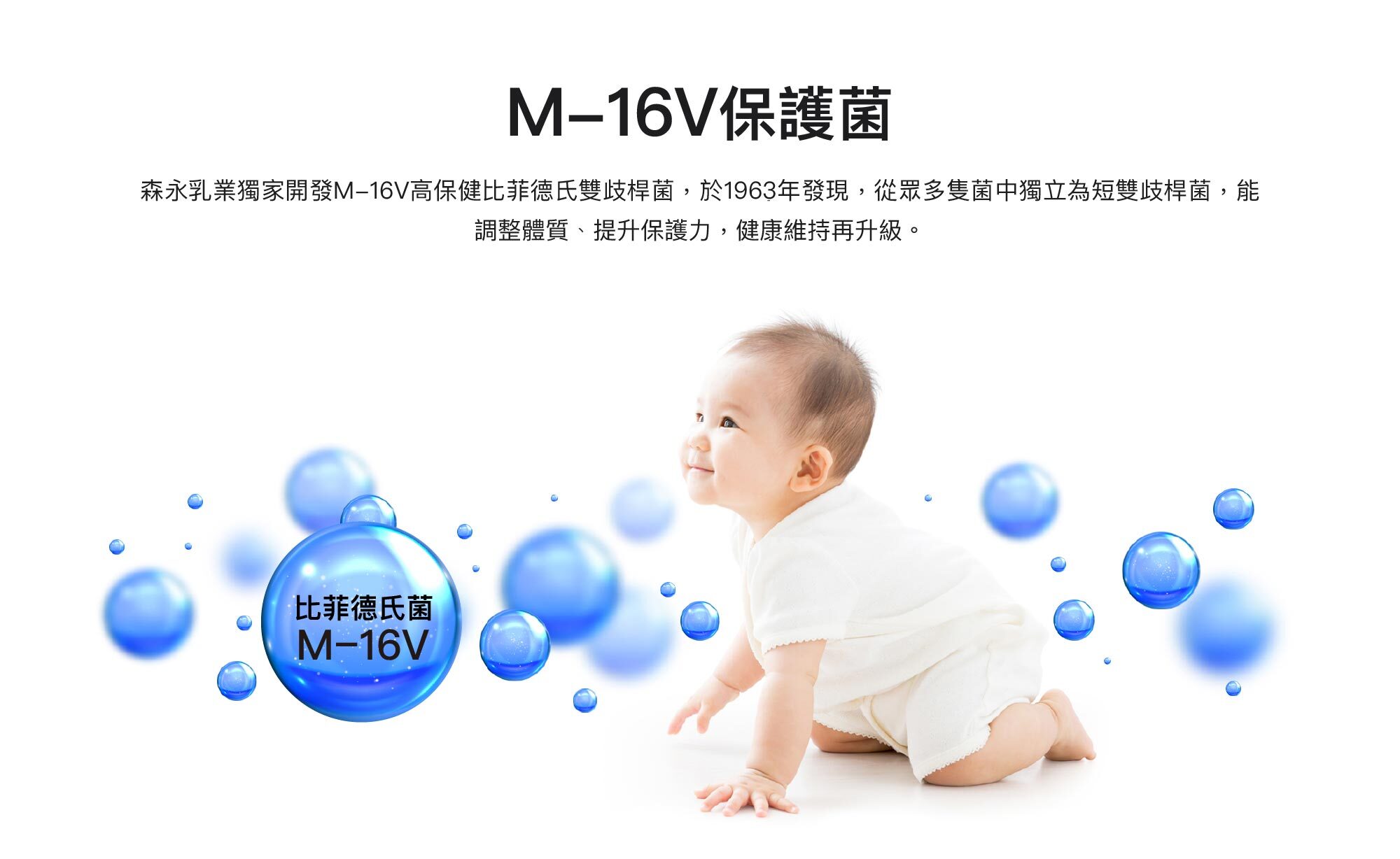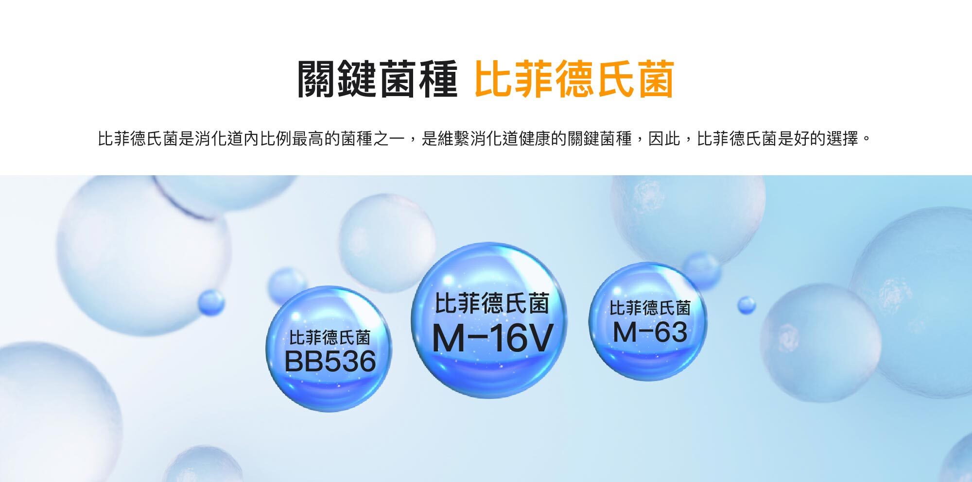 2.M-16V保護菌:日本森永乳業獨家開發M-16V高保健力比菲德氏雙歧桿菌,於1899年發現,於1924年從30多支菌中獨立為短雙歧桿菌,能調整體質、提升保護力,健康維持再升級。