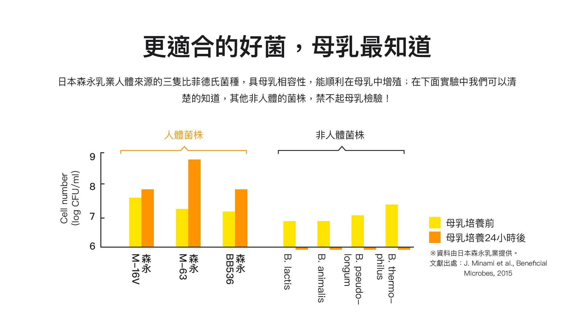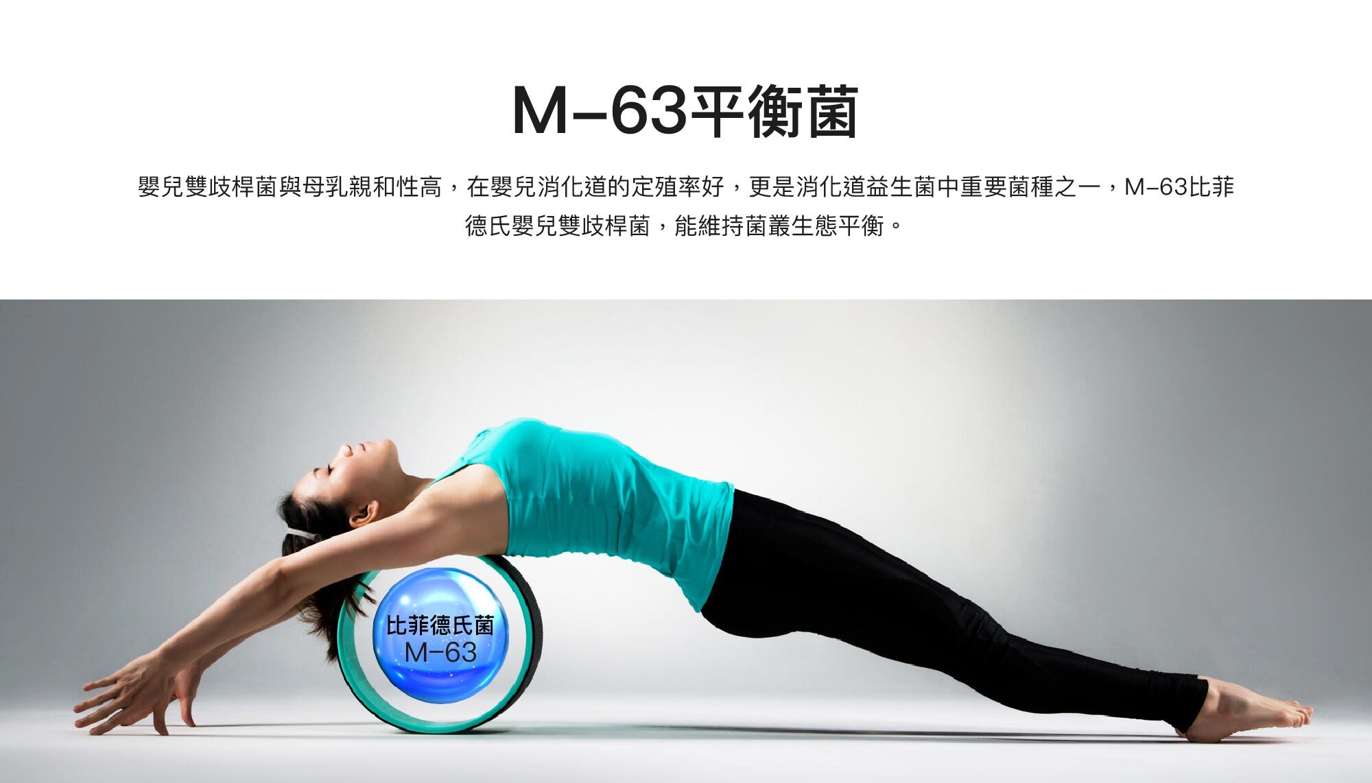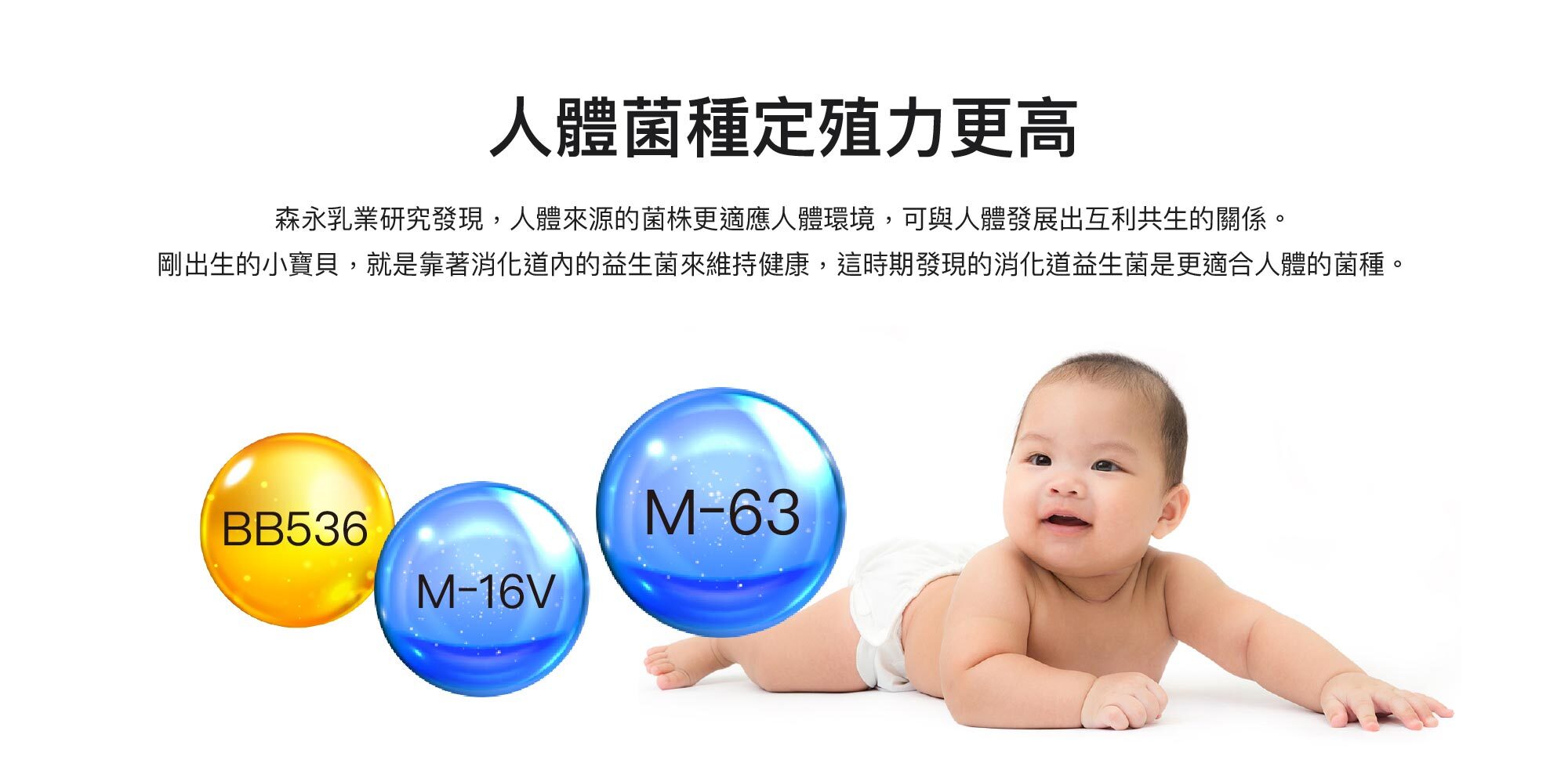 3.M-63輔生菌:嬰兒雙歧桿菌屬於寶貝與媽媽的天生自然菌種,更是消化道益生菌中重要菌種之一,M-63V比菲德氏嬰兒雙歧桿菌,能幫助改變細菌叢生態,幫助維持消化道機能。