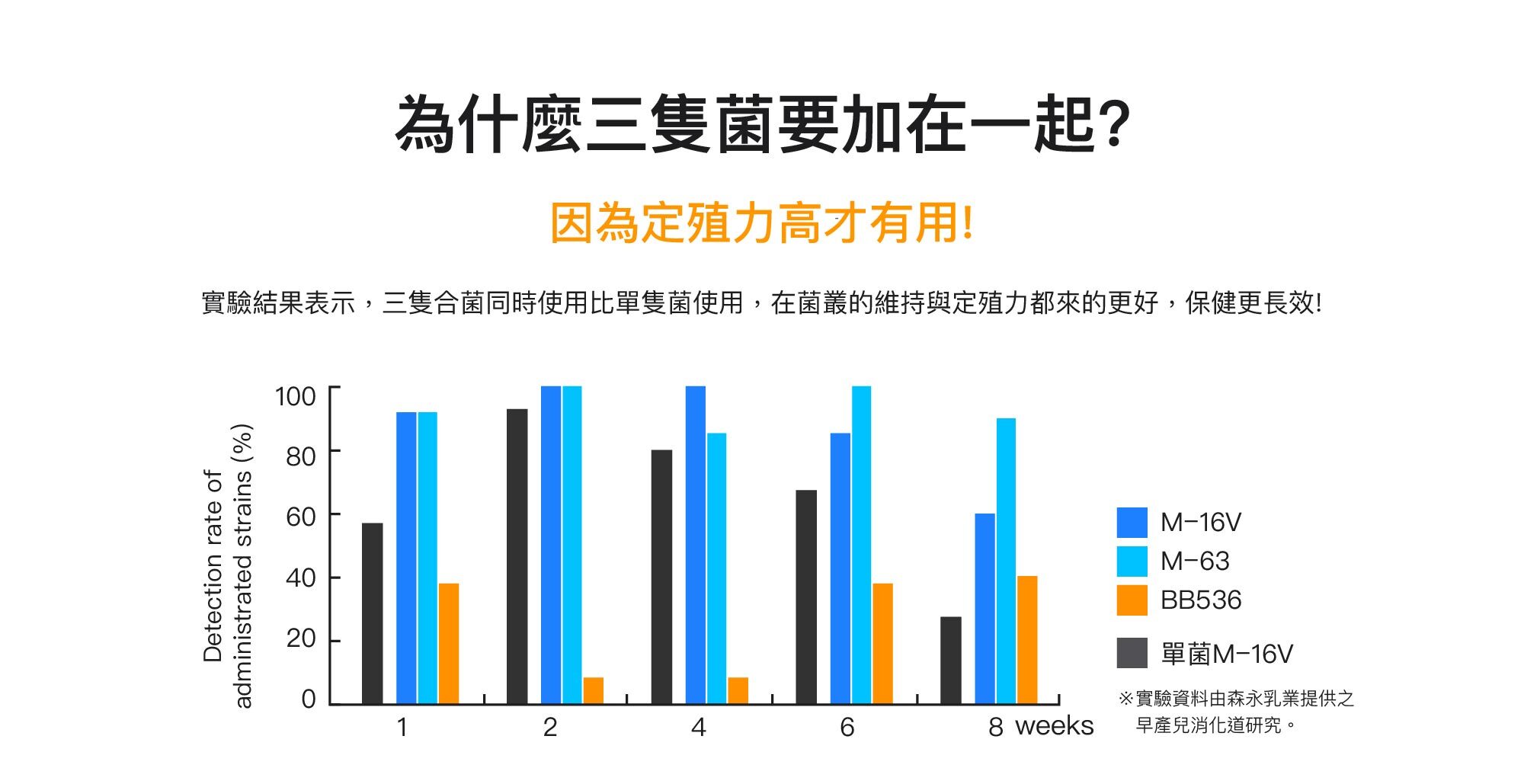 A:根據日本森永乳業實驗結果表示,來自人體的三支比菲德氏菌:BB536順暢菌、M16V保護菌、M63輔生菌,具有互相輔助的功能,且三支菌同時使用比單支菌使用,在菌叢的維持與定殖力都來的更好,保健更長效,對於全家人的保健效果更有加乘的作用!補充乳酸菌推薦大醫生技日本乳酸菌哦!