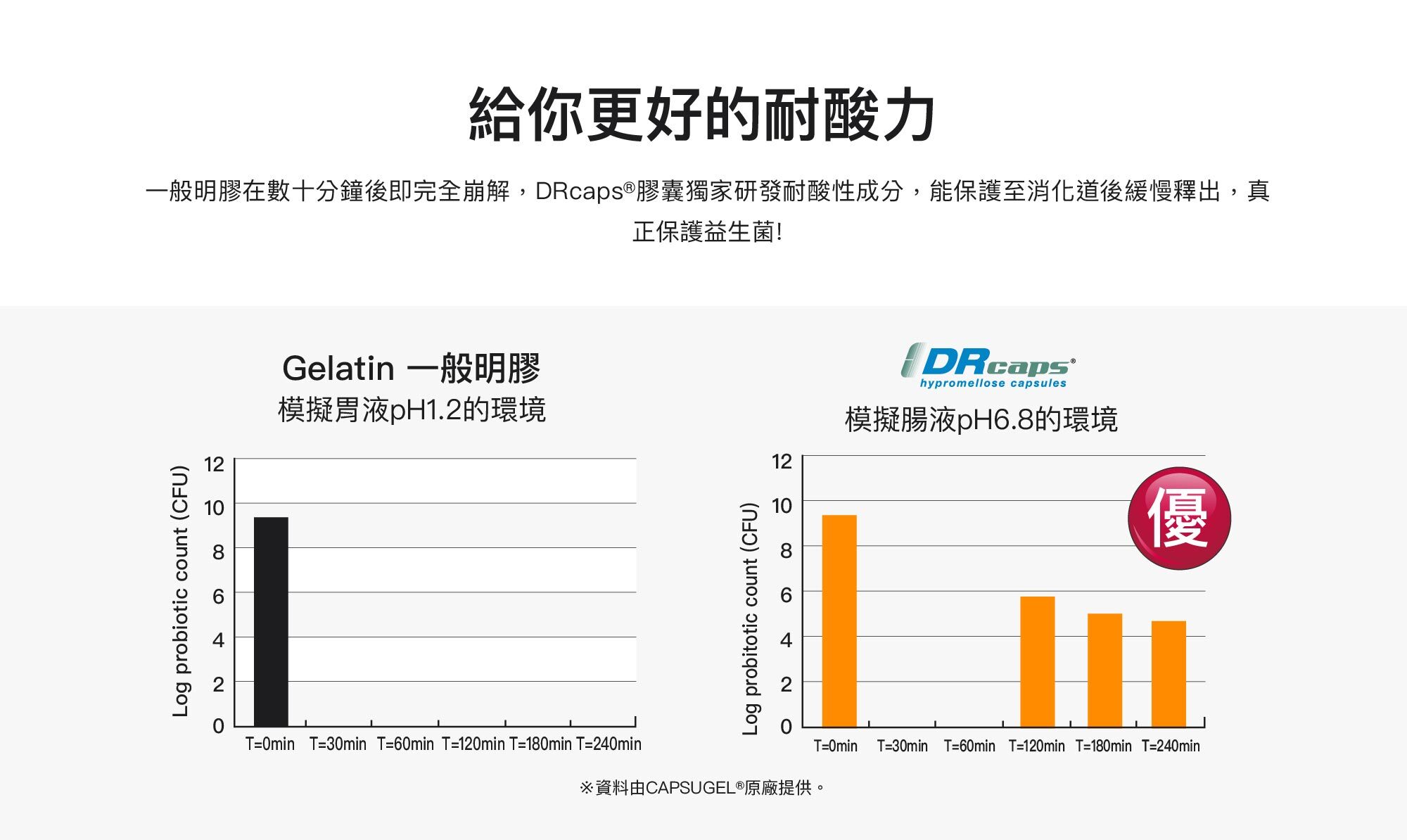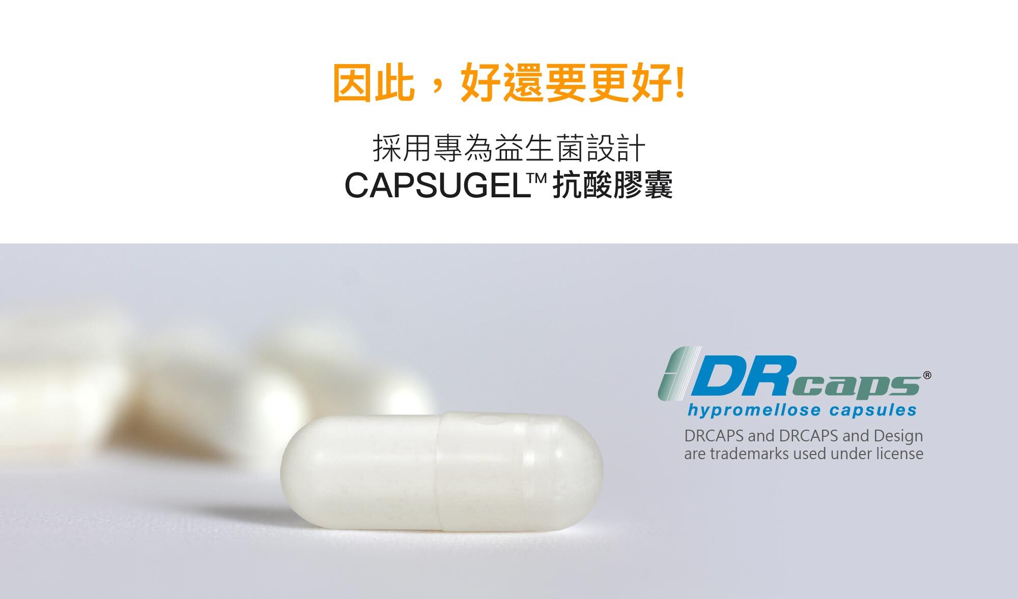 A:乳酸菌好,膠囊更不能馬虎。大醫生技採用專為益生菌設計的DRcaps Capsugel純素食膠囊,可更耐熱、4倍耐酸力、10倍慢速延遲釋放,有雙鎖口設計、耐潮性設計,能防止膠囊受潮,真正保護益生菌至消化道釋放,給你全面的保護力。