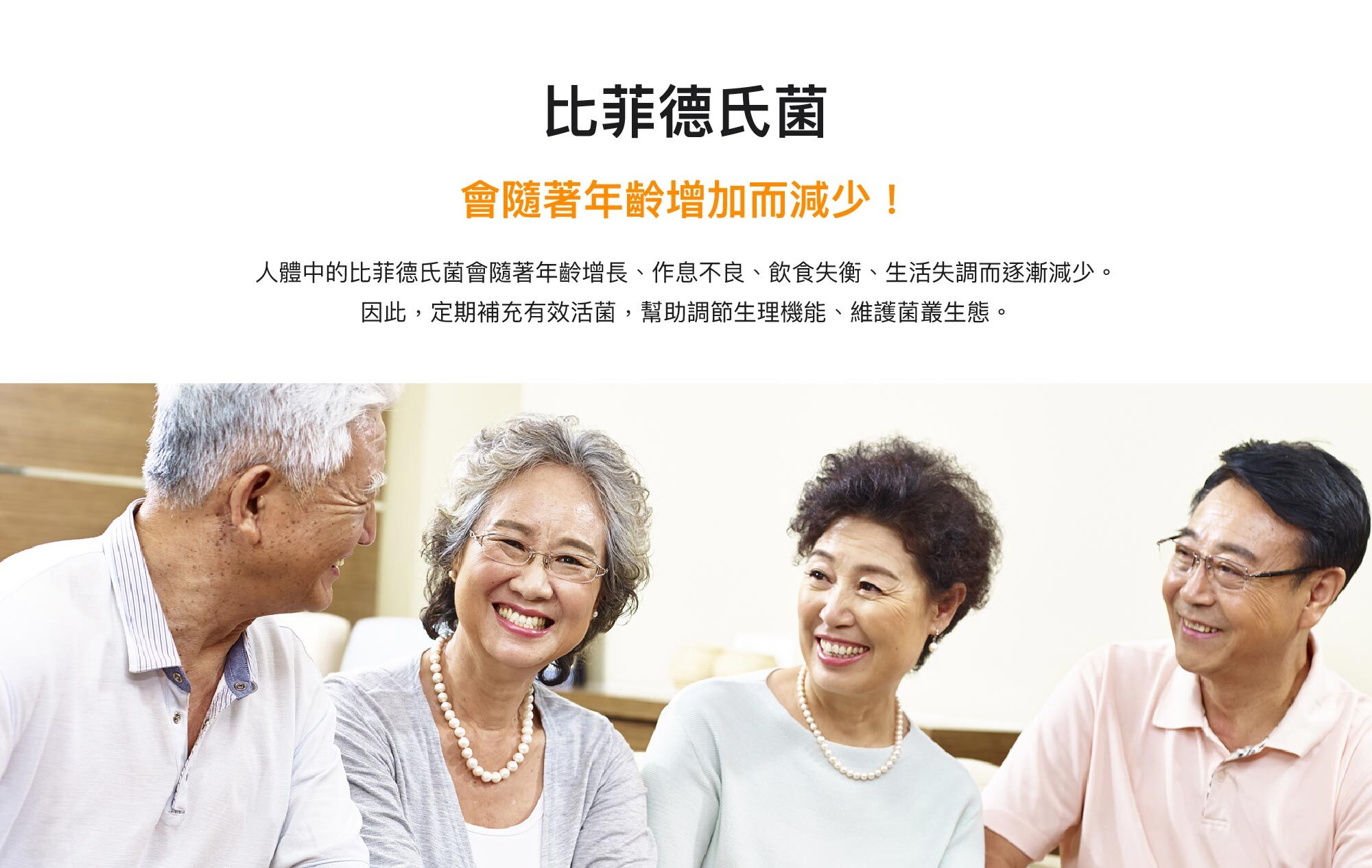 A:再好的乳酸菌也無法在消化道中久駐,要天天補充,才能維持消化道內良好的菌叢生態喔!且人體中的比菲德氏菌會隨著年齡增長、作息不良、飲食失衡、生活失調、壓力等因素而逐漸減少,更需要注意補充哦!