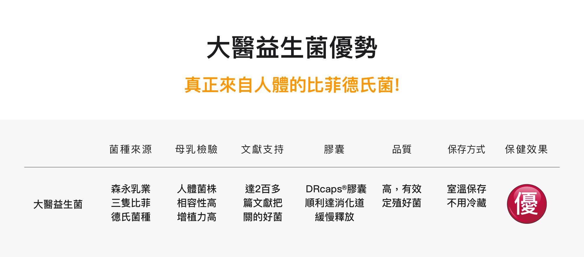 A:大醫生技乳酸菌經日本知名的森永乳業授權使用,三支益生菌皆是人體來源菌株。日本森永乳業研究發現,人體來源的菌株比一般菌株更適應人體環境,定殖性更強!且可與人體發展出互利共生的關係,效果比其他來源益生菌更優。剛出生的小寶貝,就是靠著消化道內的益生菌來維持健康,這時期發現的消化道益生菌其實就是更適合人體的菌種。