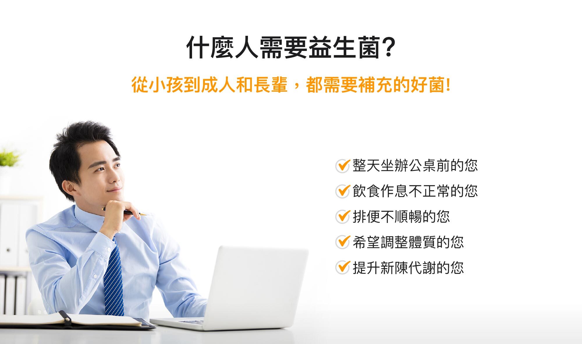 A:益生菌中頗具代表性的就是比菲德氏菌,但人體中的比菲德氏菌會隨著年齡增長、作息不良、飲食失衡、生活失調、壓力等因素而逐漸減少。想要維持良好消化道機能,建議持續積極的補充益生菌,定期補充有效活菌,可幫助調節生理機能、維護菌叢生態。因此,整天坐在辦公桌前的上班族、三餐不固定的外食族、排便不順暢、想調整體質、提升新陳代謝的人,從小孩到成人、長輩、孕婦、哺乳,都需要補充好菌,益生菌乳酸菌推薦大醫生技哦!