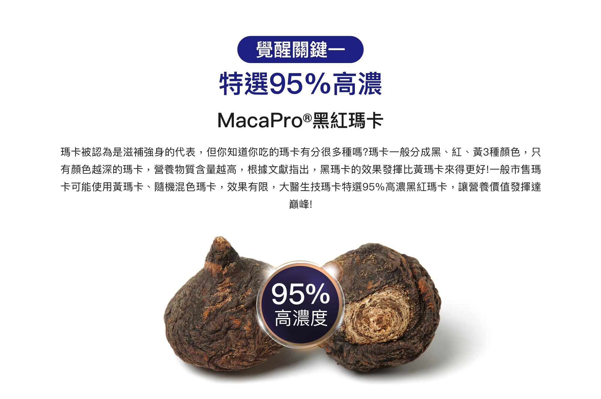 ANS:瑪卡基本分成黑、紅、黃3種顏色,而顏色越深的瑪卡,其營養物質的含量越高,其中黑色瑪卡僅佔每年收成的15%,被認為是強壯與精力的代表。一般市售馬卡,可能使用黃瑪卡、隨機混色瑪卡,效果有限,大醫生技瑪卡萃取複方錠嚴選高達95%黑紅瑪卡,營養價值更高!