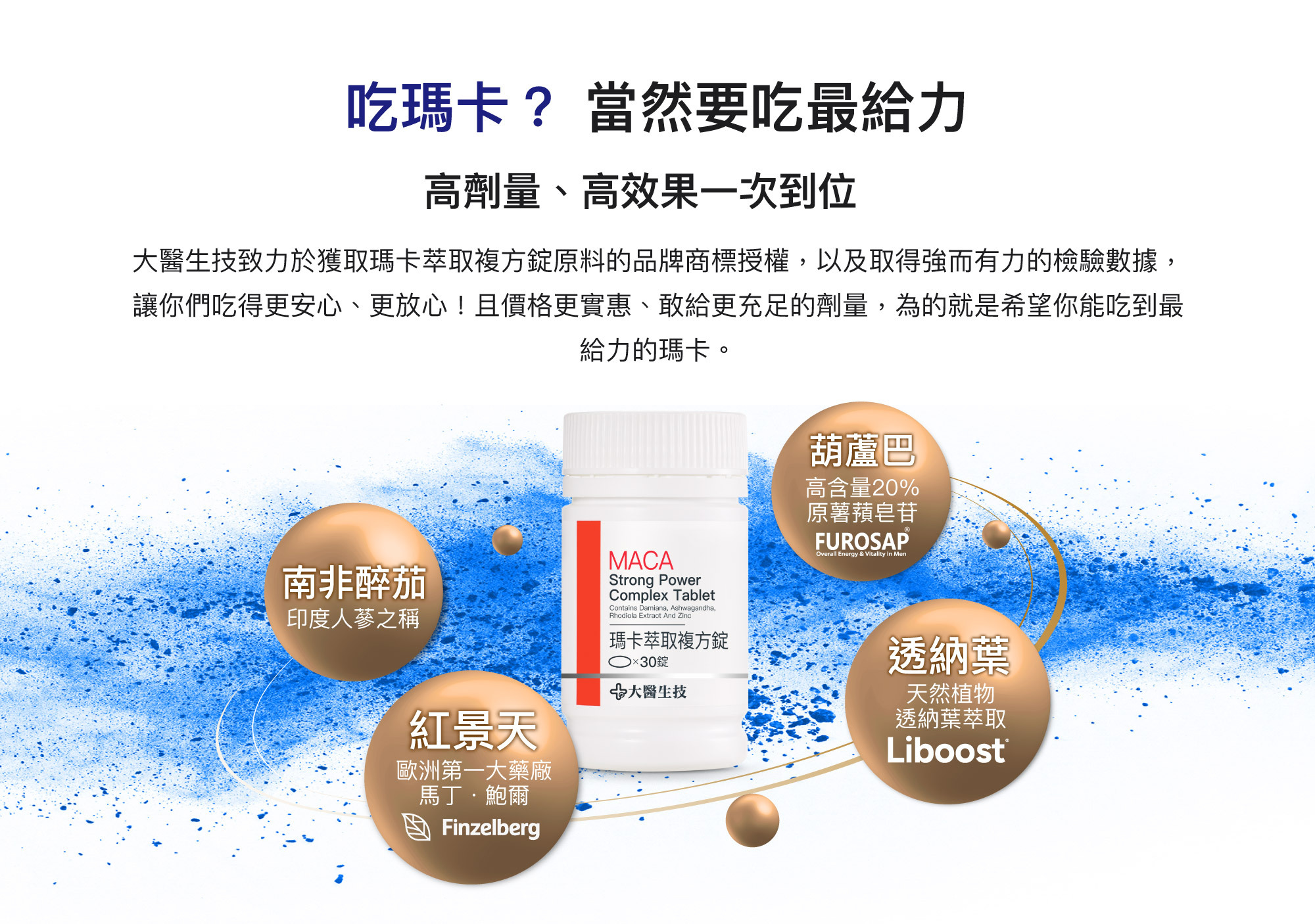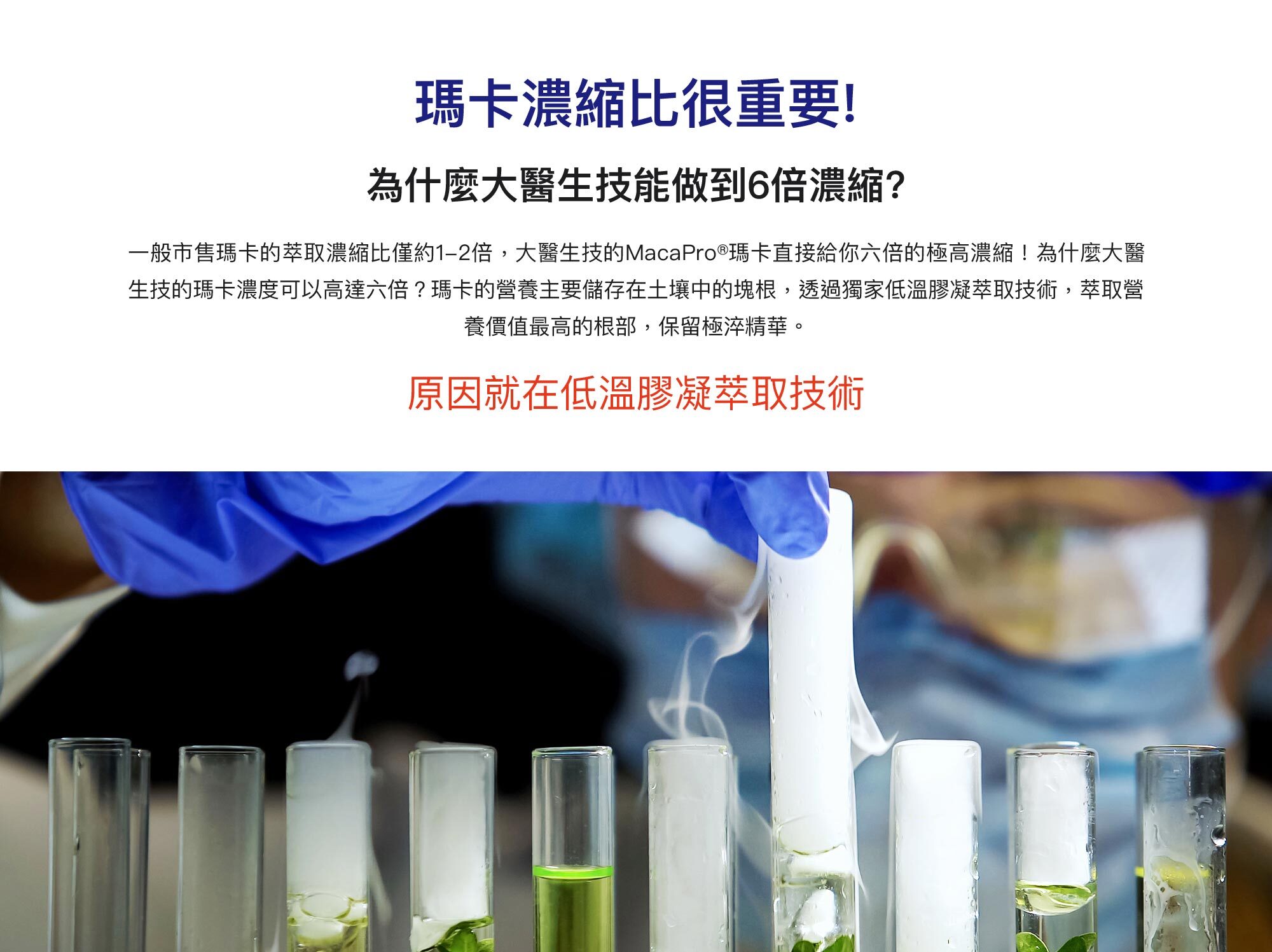 ANS:大醫生技採用的瑪卡來自於祕魯,其原廠UHTCO位於加拿大,創立於2003年,是第一個釋放瑪卡全部潛能的公司,提供最高品質和獨特的Maca產品MacaPro®。 MacaPro®來自秘魯安第斯山脈當地農民種植的純淨瑪卡,不同於市售常用的黃瑪卡,MacaPro®為95%深色黑紅瑪卡,使用營養價值最高的根部,以6:1的比例萃取,6公斤的瑪卡根,僅萃取出1公斤的瑪卡粉末,獨家低溫膠凝萃取技術,易消化、好吸收,提供營養成分最完整的瑪卡。