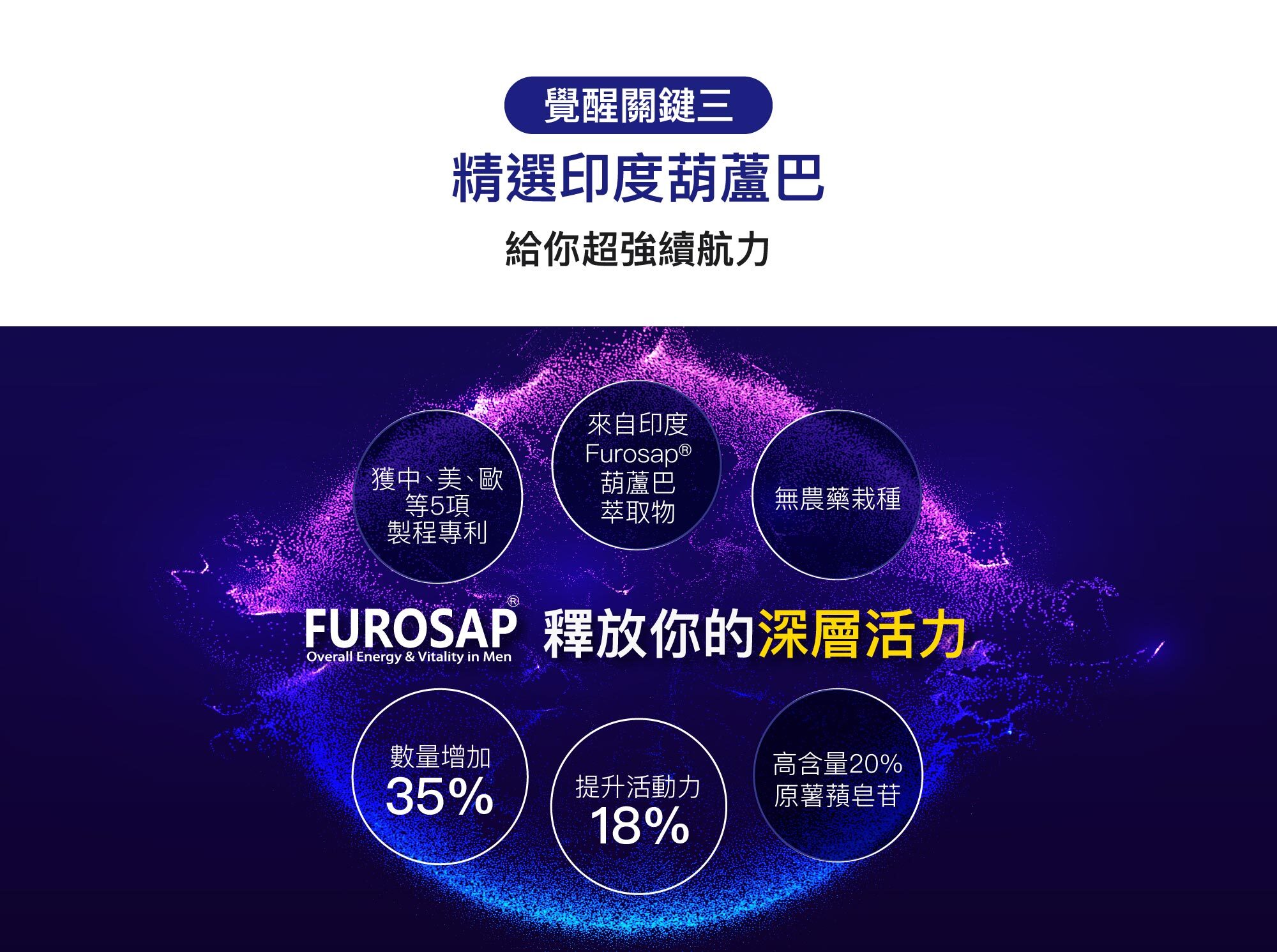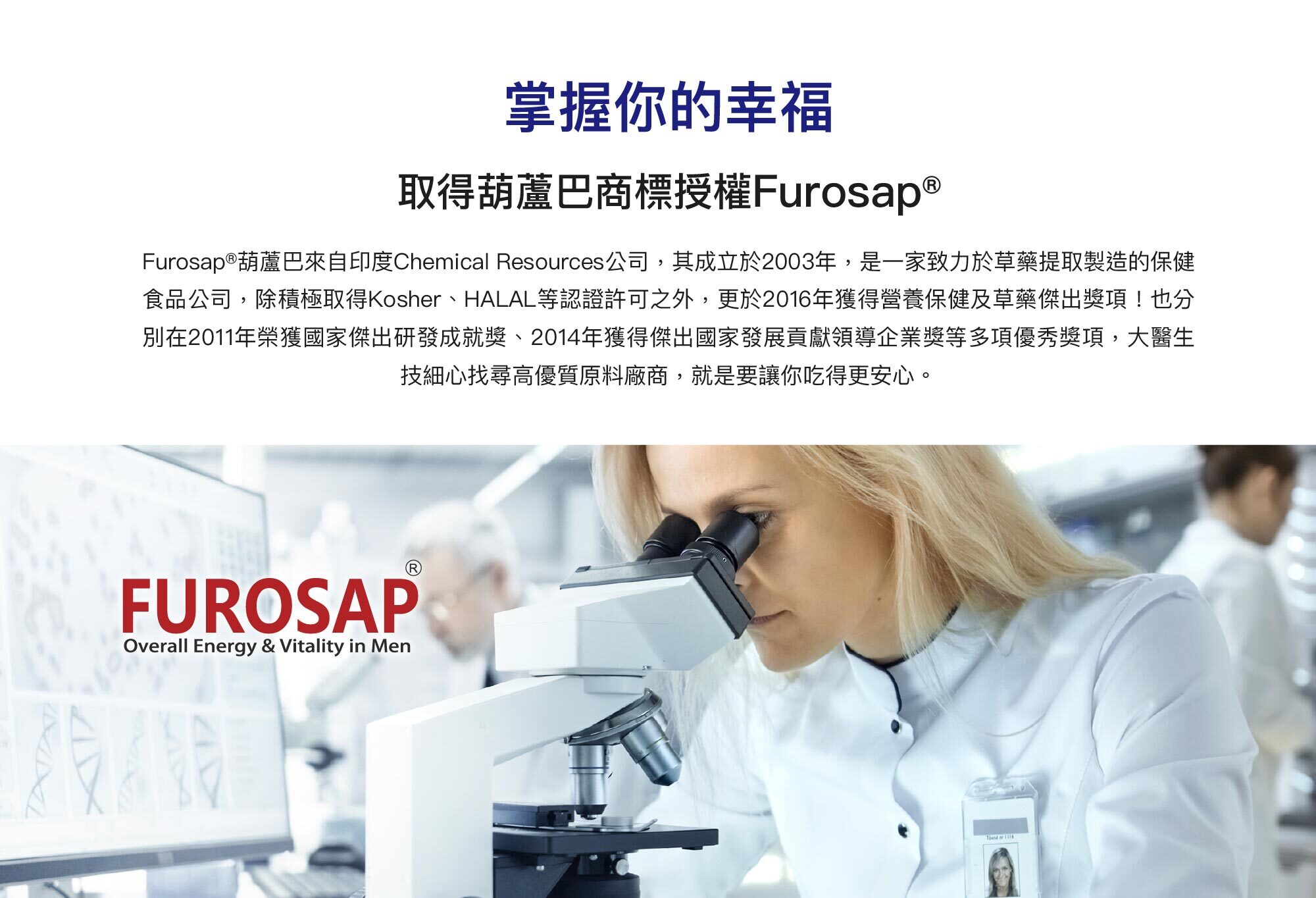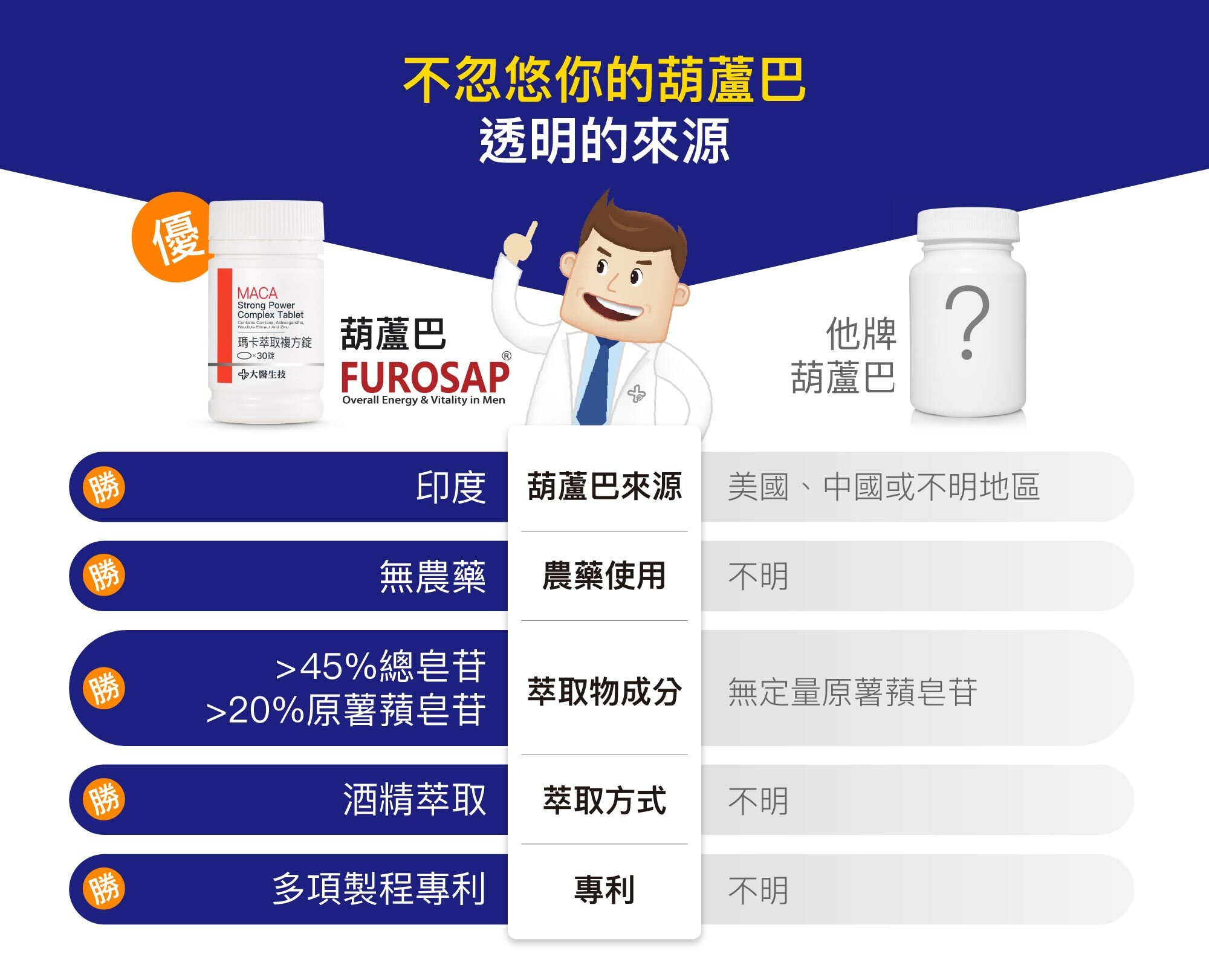 ANS:大醫生技採用FUROSAP®葫蘆巴,其萃取自印度無農藥栽種的天然葫蘆巴種子,含45%以上總皂苷,其中關鍵成分原薯蕷皂苷(Protodiscin)含20%以上,經過兩項人體臨床試驗,並獲得中、美、歐5項製程與功效專利(US 8754205 B2、US 8217165 B2、CN102448479 B、EP2285821 B1、EP2437763 B1)。
