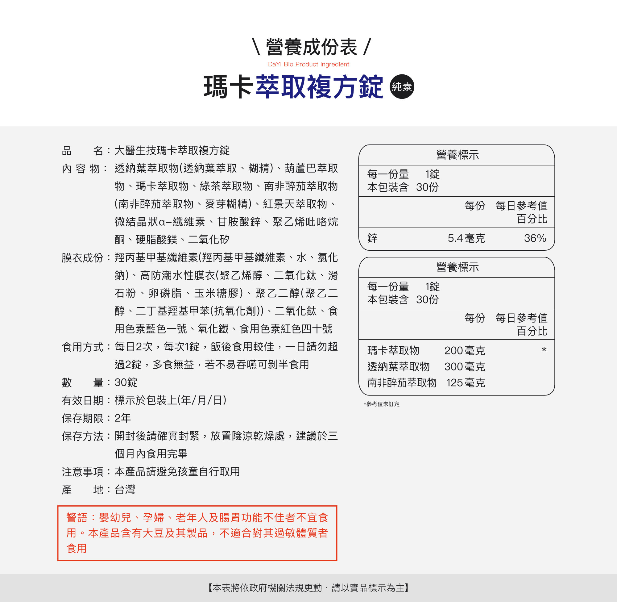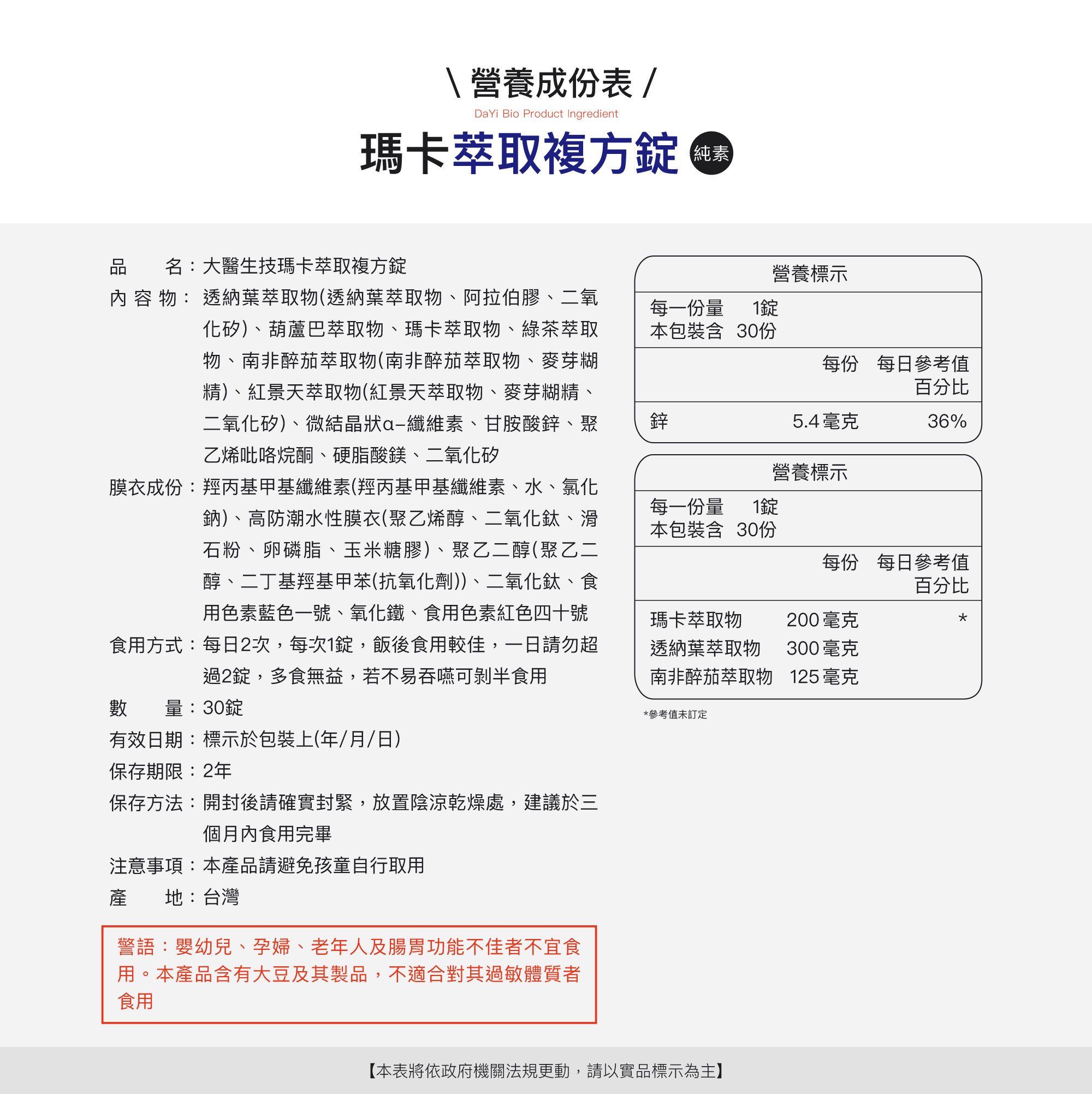 ANS:透納葉萃取物(透納葉萃取物、阿拉伯膠、二氧化矽)、葫蘆巴萃取物、瑪卡萃取物、綠茶萃取物、南非醉茄萃取物(南非醉茄萃取物、牛奶)、紅景天萃取物(紅景天萃取物、麥芽糊精、二氧化矽)、微結晶狀α-纖維素、甘胺酸鋅、聚乙烯吡咯烷酮、硬脂酸鎂、二氧化矽。※每一錠含鋅5.4毫克、瑪卡萃取物200毫克、透納葉萃取物300毫克。