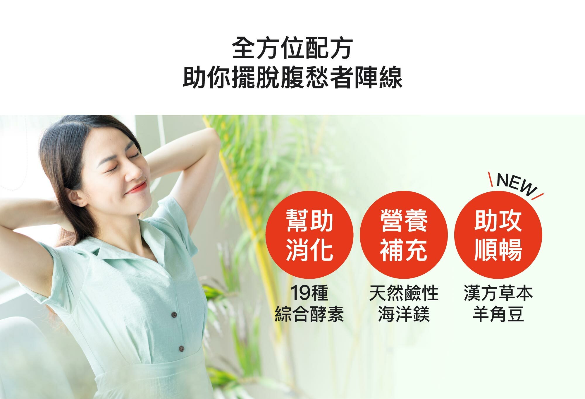 ANS:淨暢酵素錠添加美國n.zimes綜合酵素(含豐富19種消化酵素)、海水抽出物(含鎂)及漢方草本羊角豆萃取物,可幫助消化、使排便順暢。