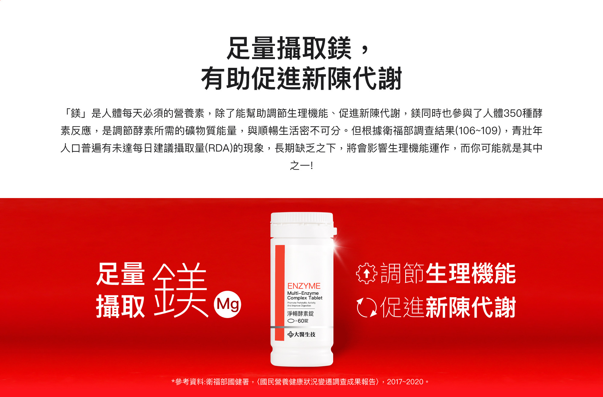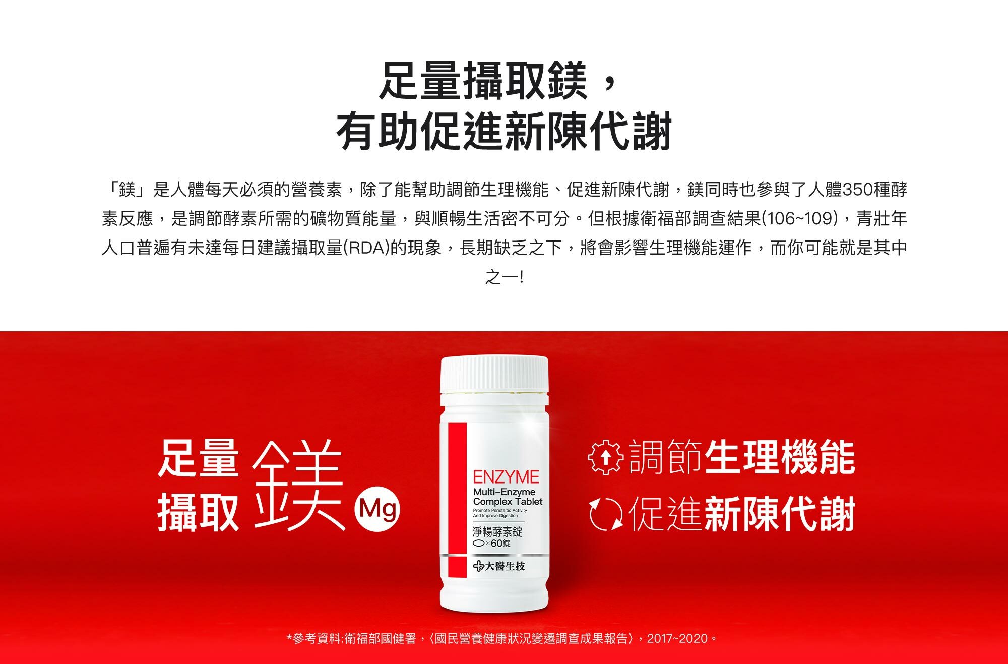 ANS:淨暢酵素嚴選純淨海洋鎂,每1錠含鎂量為247.5mg,達衛福部國民健康署建議19歲~50歲每日攝取量,有助促進新陳代謝。