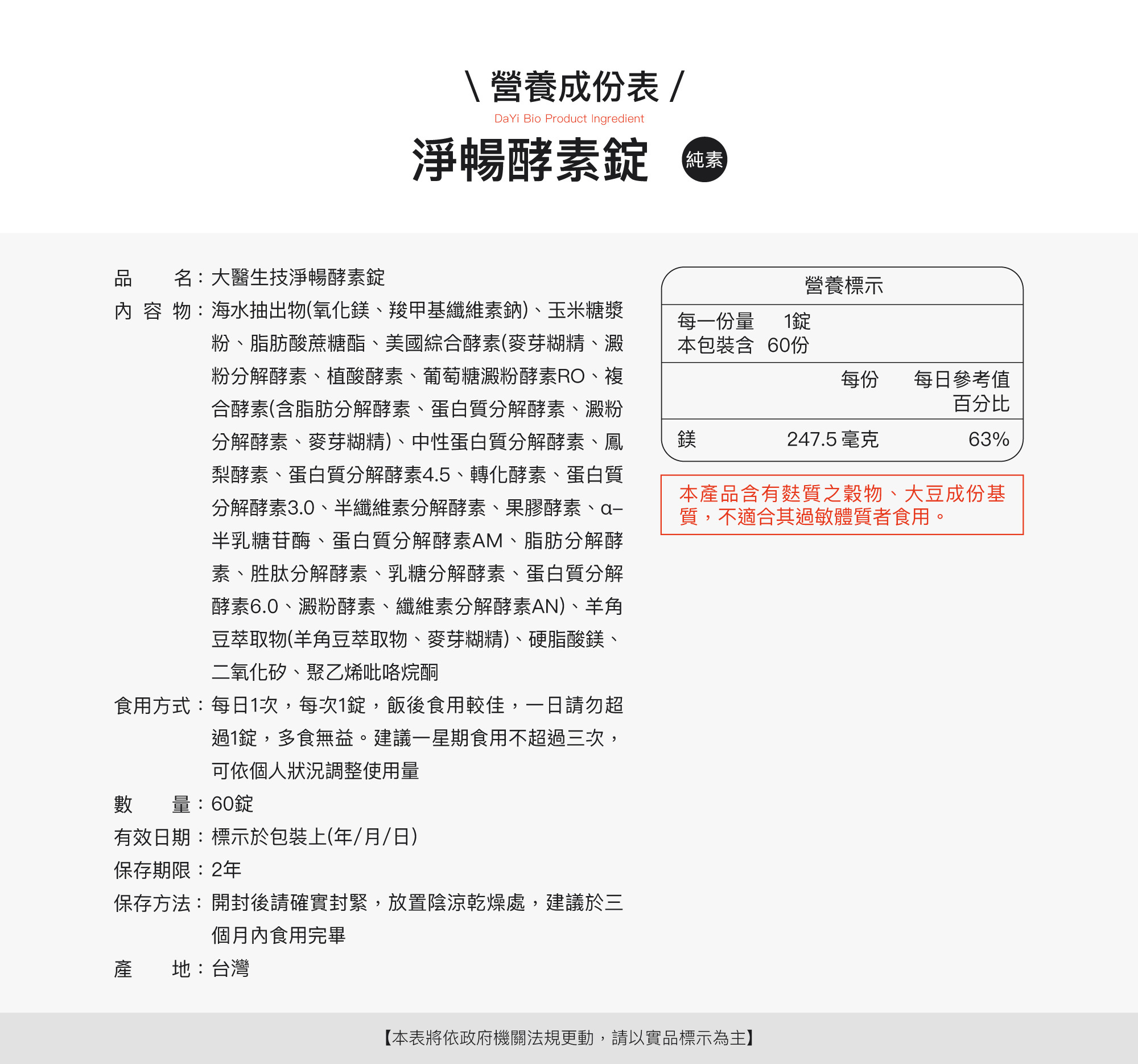 1.本產品含有麩質之穀物、大豆成份基質,不適合其過敏體質者食用 (綜合酵素的培養基有使用到小麥、大豆)。