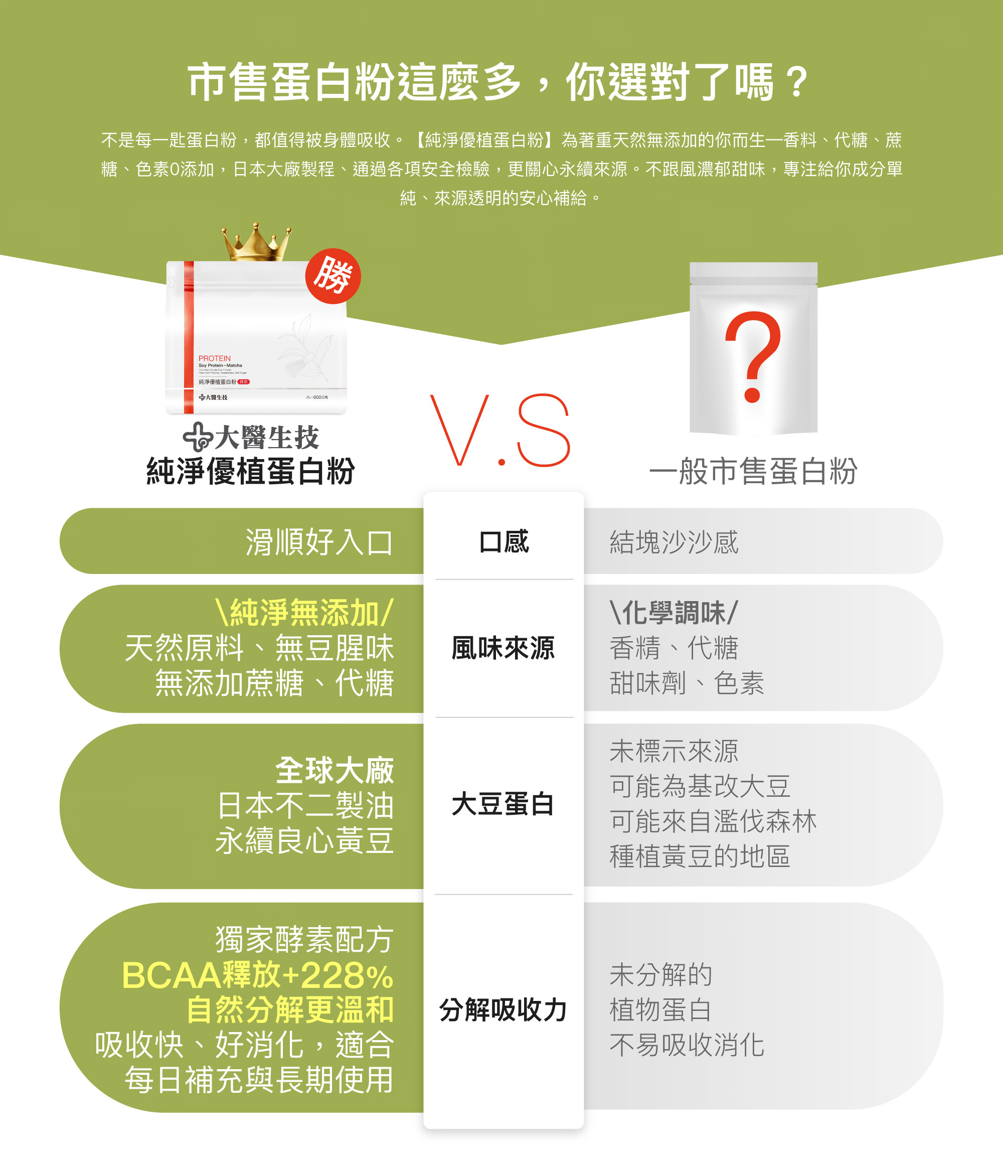 大醫生技純淨優植蛋白粉抹茶風味,無香料、無代糖、無蔗糖、奶素也能安心喝, 添加獨家酵素,幫助 BCAA釋放+228%,純淨無負擔配方,適合銀髮族、飲控族、外食族、健身族日常補充。