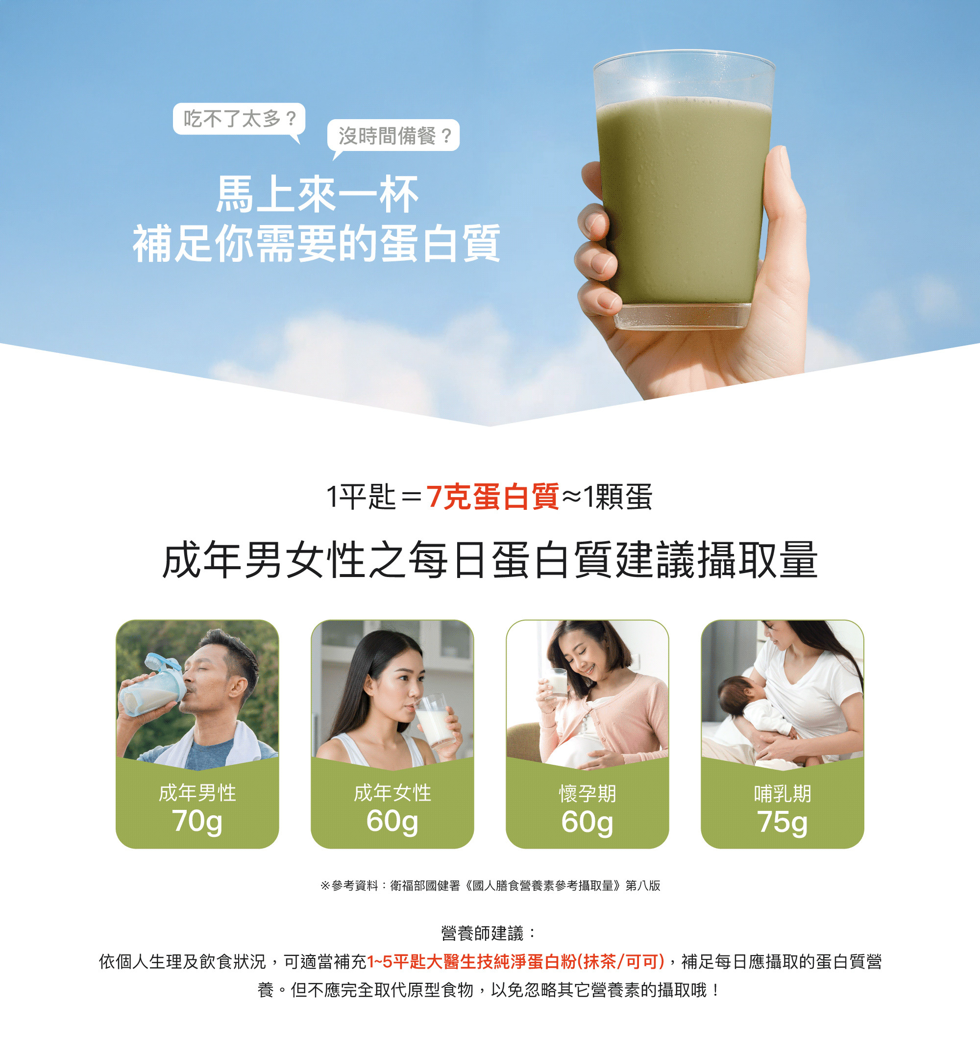 • 1 平匙 =7克蛋白質,適合日常營養補充