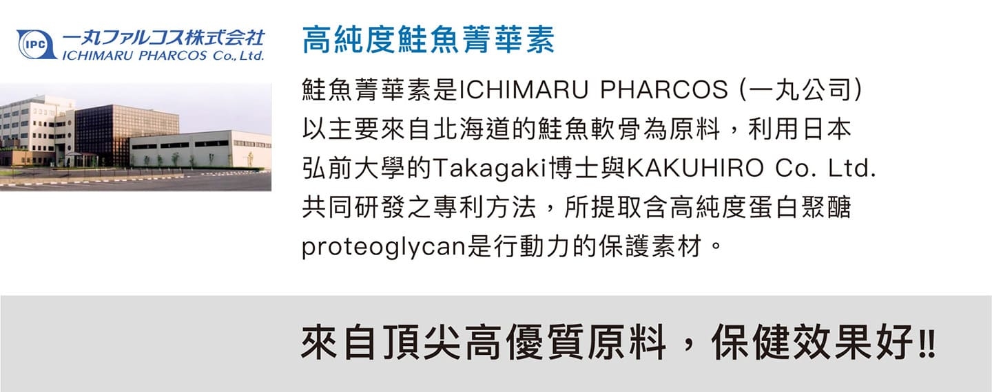 ANS:日本 KOYOSAMINE 高純度葡萄糖胺,通過 7 項日本專利認證、及多項功效性研究和毒理、安定性測試,來源可溯性明確。