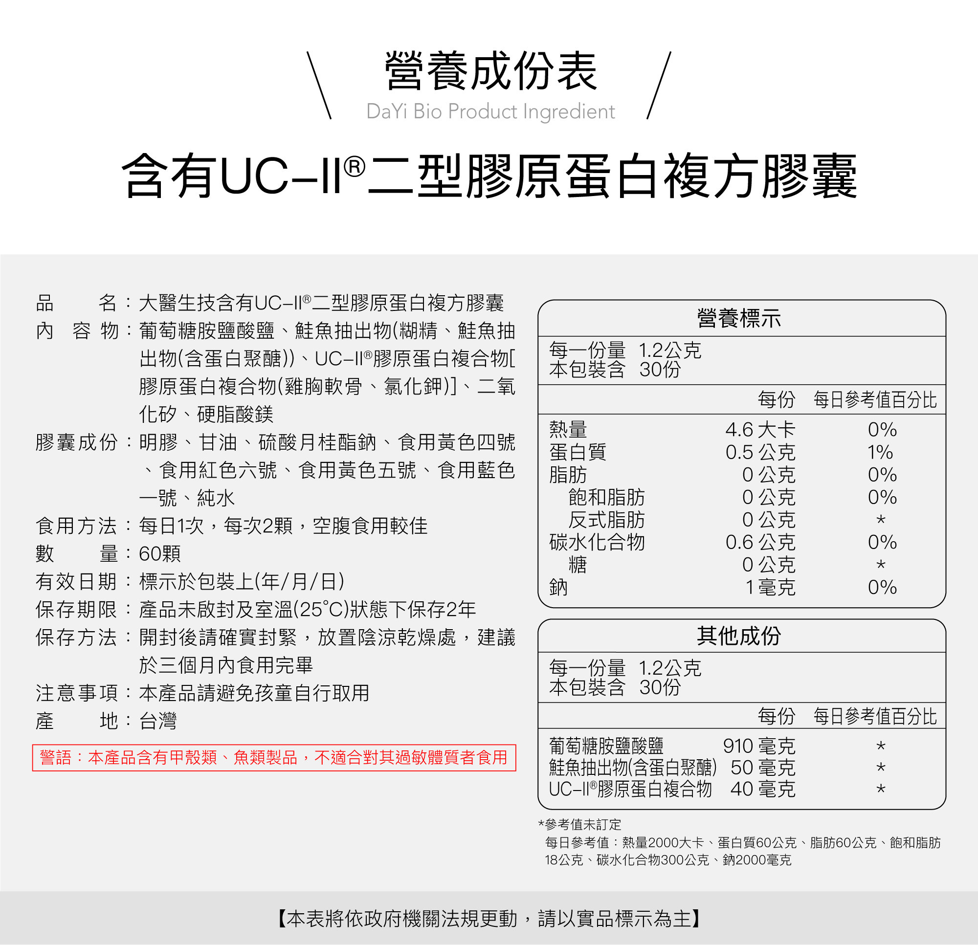 大醫生技含有UC-II二型膠原蛋白,為低溫專利萃取技術保留活性,非變性完整保留UC-II膠原蛋白三股螺旋結構,特添日本KOYOSAMINE高純度葡萄糖胺、高品質日本鮭魚菁華,讓你展現靈活行動力!