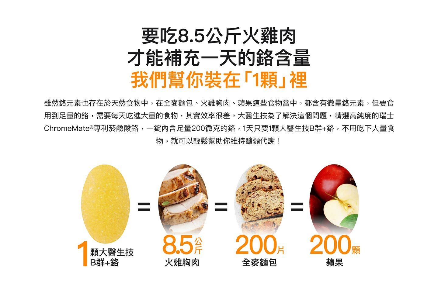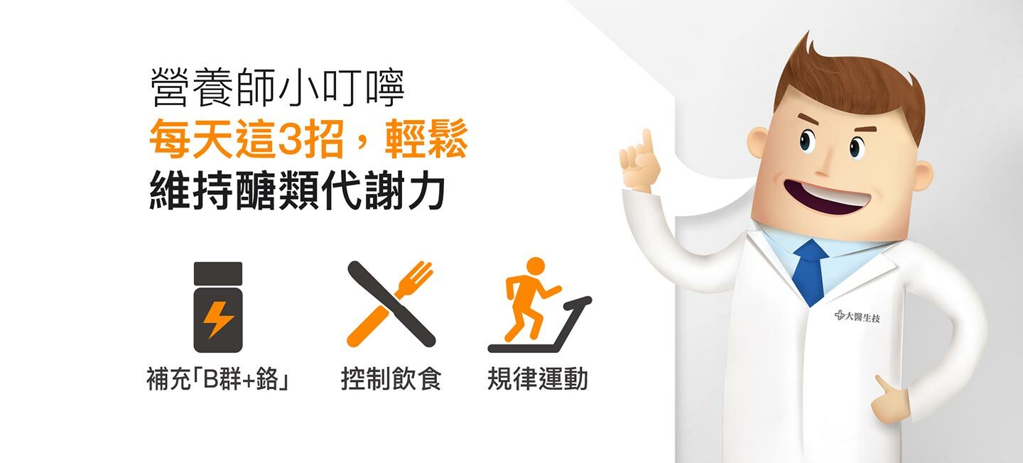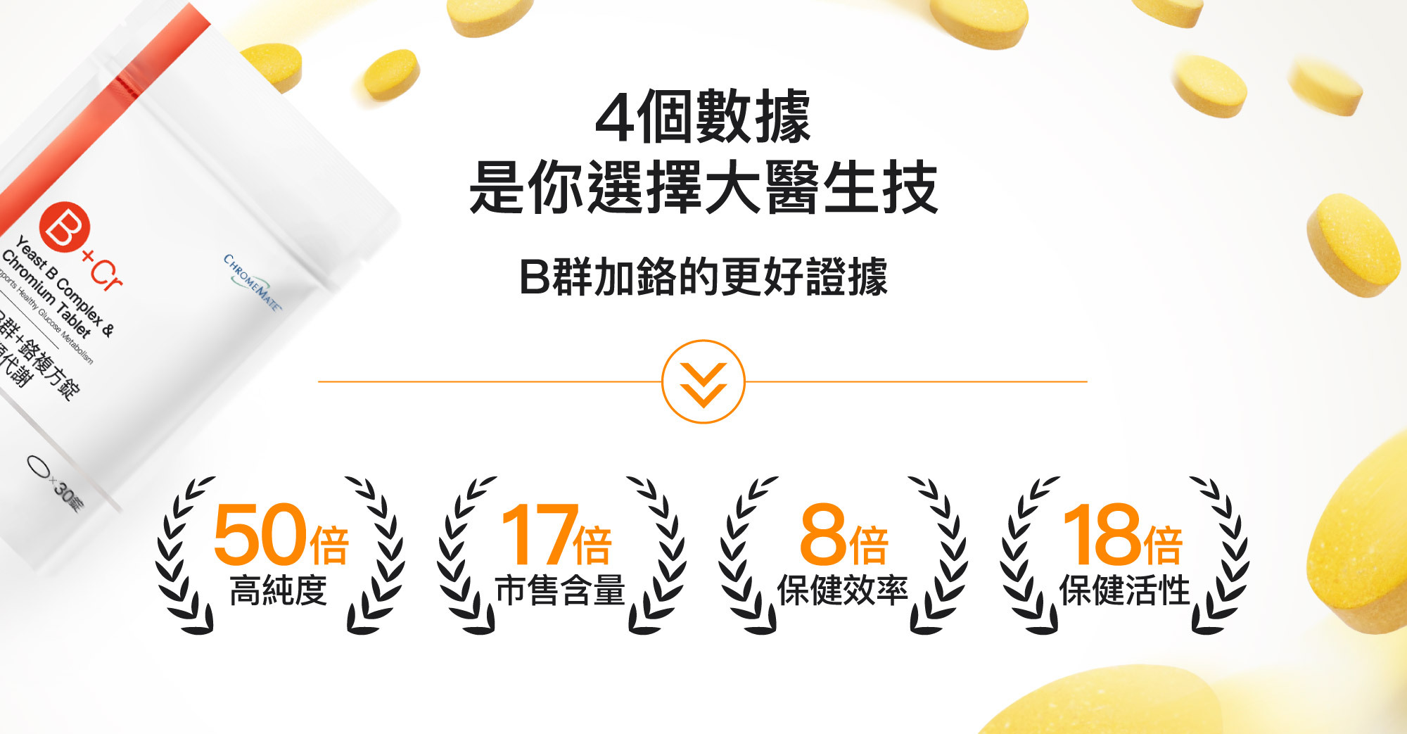 高血糖怎麼辦?血糖高降血糖保健食品推薦B群+鉻複方錠,補充大醫生技B群+鉻有助維持醣類正常代謝。選用Chromate菸鹼酸鉻,生物利用率為吡啶甲酸鉻的8倍。