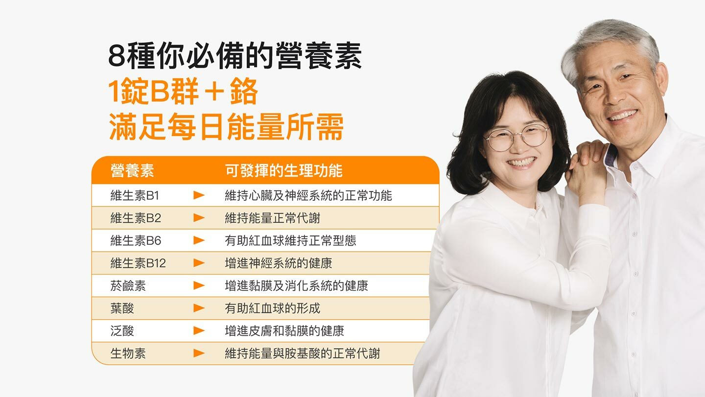 鉻有助於維持醣類正常代謝,而維生素B群如B1、B2、菸鹼素、生物素、泛酸,有助於維持能量正常代謝,兩者搭配補充效果更好,一天一錠B群+鉻,可幫助調節生理機能、維持健康哦!