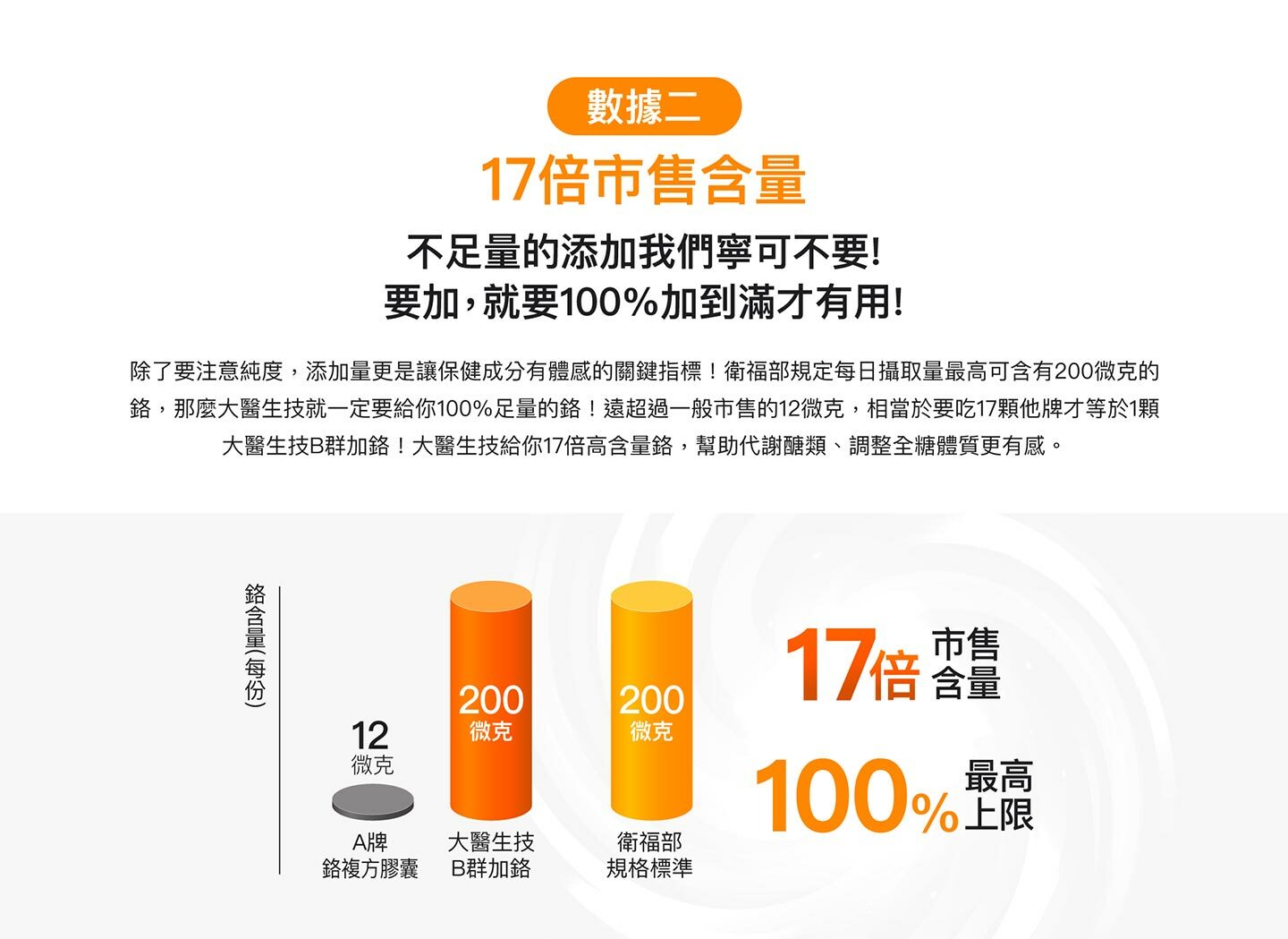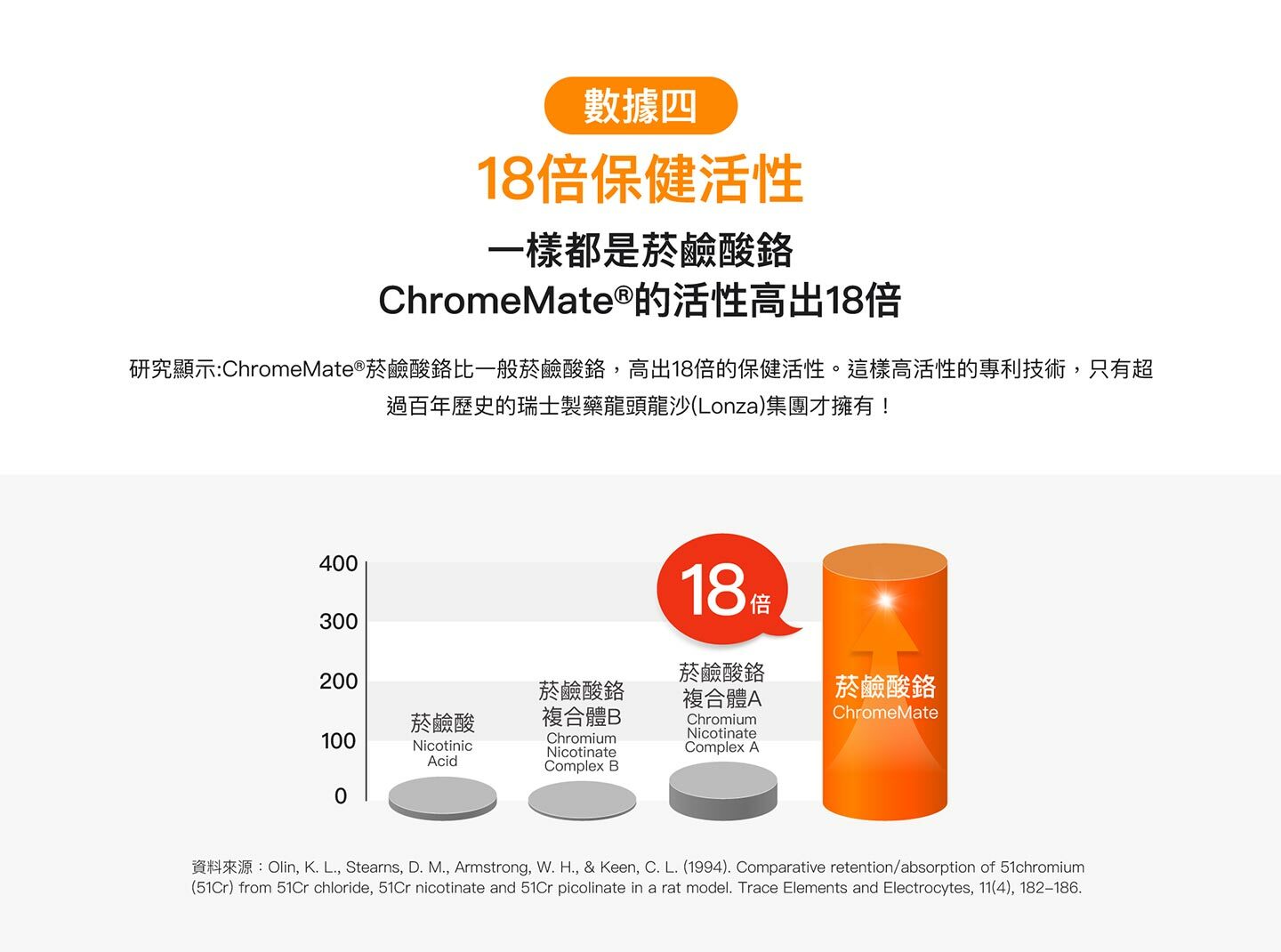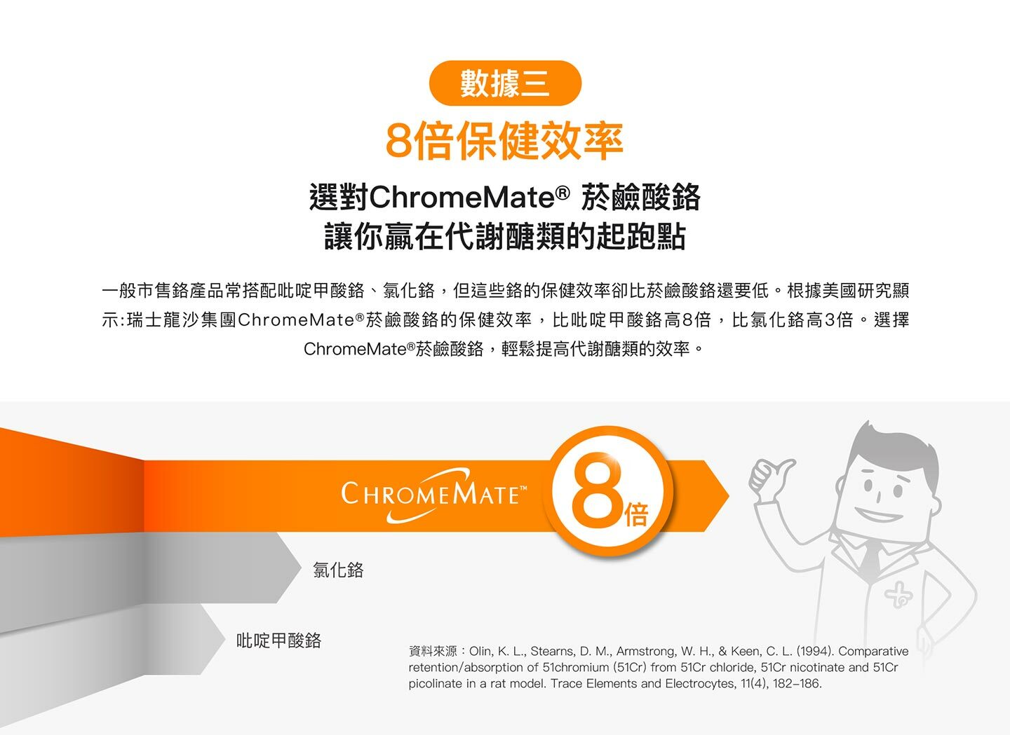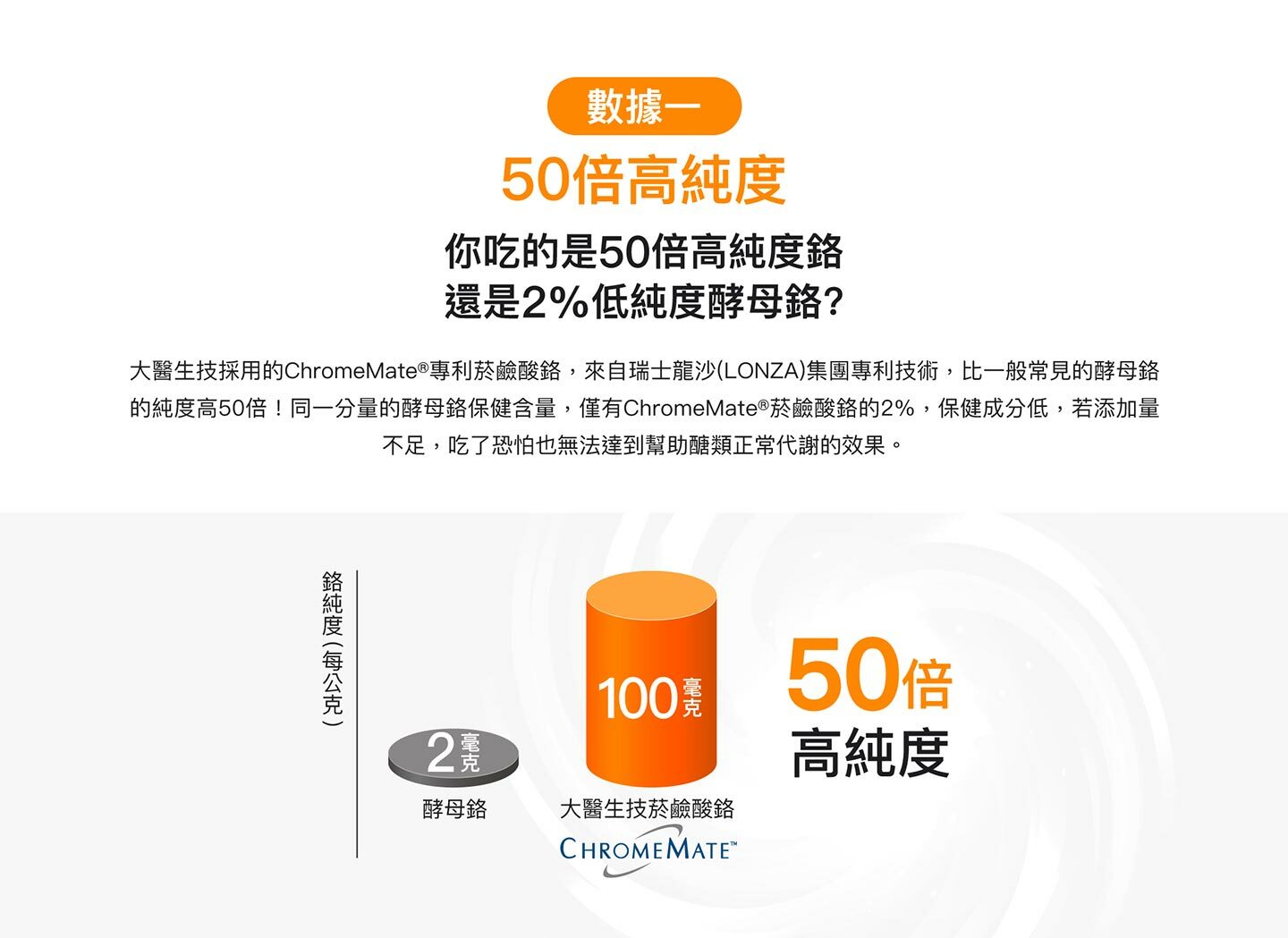 大醫生技特別選用瑞士龍沙集團(Lonza)的ChromeMate®專利菸鹼酸鉻,其生物利用率為吡啶甲酸鉻的8倍、氯化鉻的3倍、其他菸鹼酸鉻的18倍,有26篇研究報告、六項專利認可,並取得美國GRAS認證,食用上安全無虞哦!