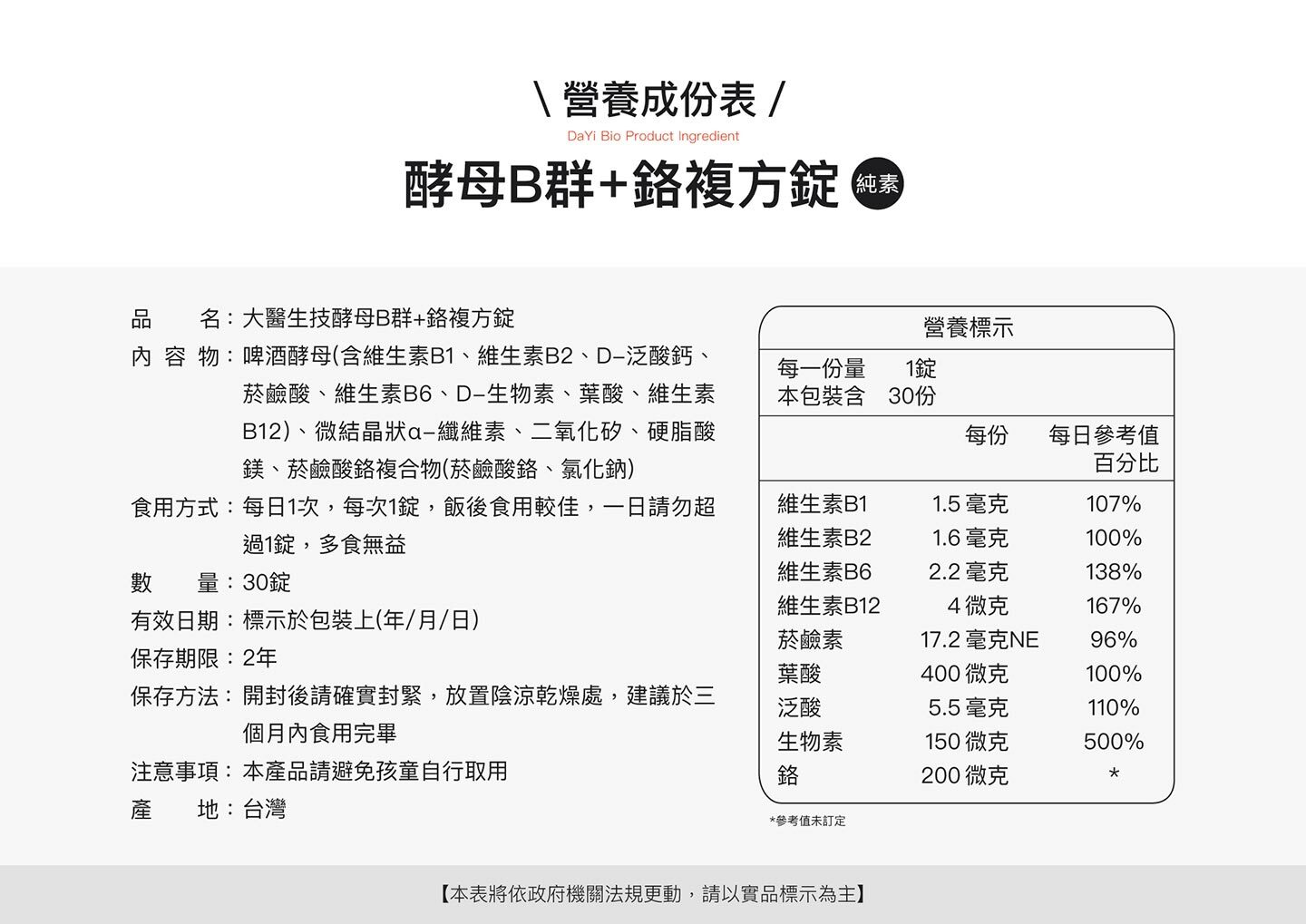 鉻並沒有訂定每日建議攝取量,法規規定,每日食用量中,其鉻之總含量不得高於200微克,大醫生技B群+鉻複方錠每錠含菸鹼酸鉻2mg,其中含有鉻200微克,建議一天吃一顆就可以了喔!